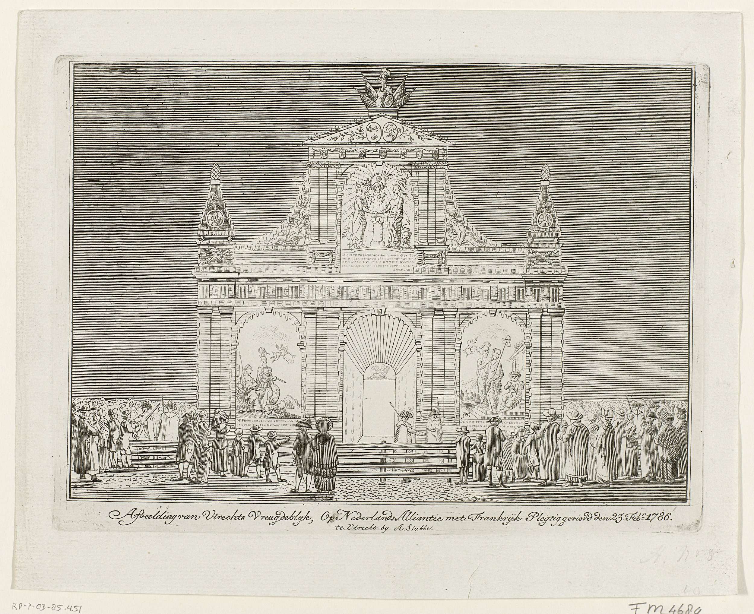 Geïllumineerde triomfpoort het allegorische voorstellingen, bij de viering van de Alliantie met Frankrijk, in opdracht van de Burgersociëteit Concordia of De Eendracht te Utrecht, aan de Mariaplaats te Utrecht op 23 februari 1786.
