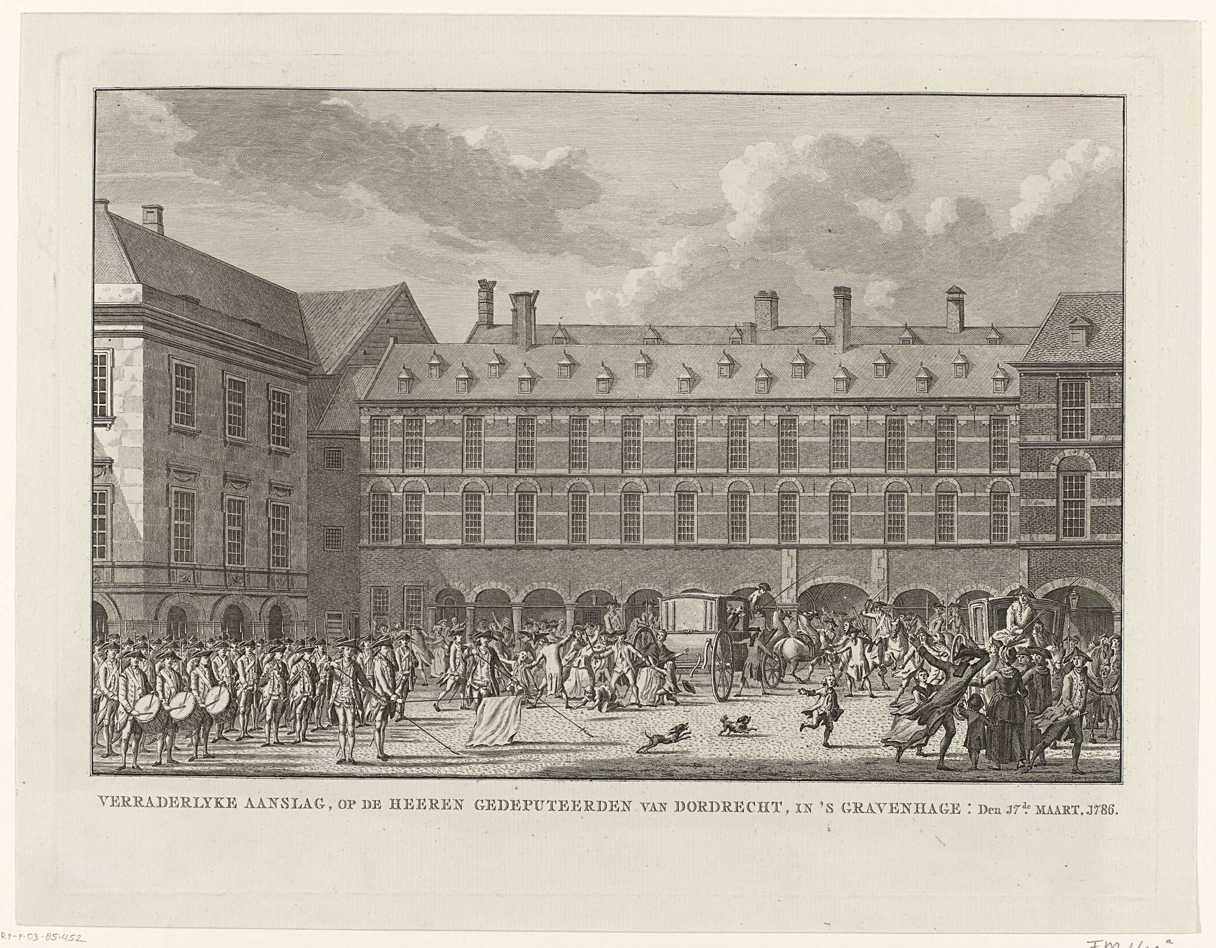 Ongeregeldheden als de gedeputeerden van Dordrecht, de heren Gevaerts en De Gijzelaar, met hun rijtuig door de Stadhouderspoort het Binnenhof op rijden en hun paarden bij de toom worden gegrepen door de Haagse pruikenmaker F. Mourand, 17 maart 1786. Links de opgestelde schutterij, rechts verdedigt de advocaat Van Nispen de koets.