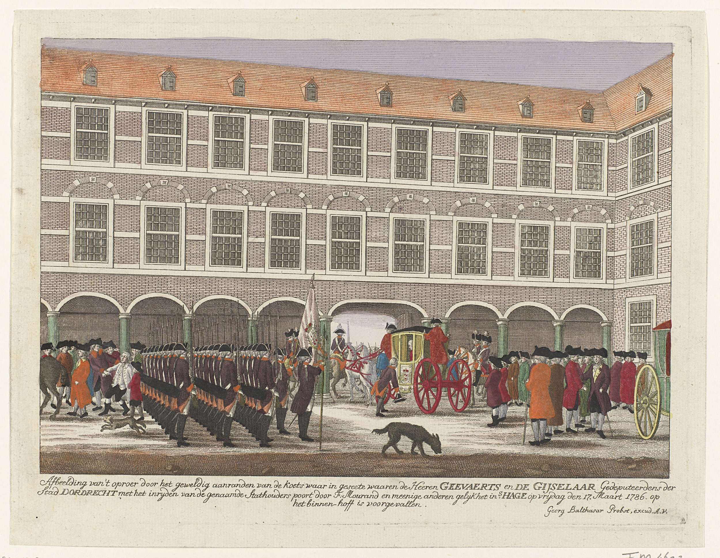 Ongeregeldheden als de gedeputeerden van Dordrecht, de heren Gevaerts en De Gijzelaar, met hun rijtuig door de Stadhouderspoort het Binnenhof op rijden en hun paarden bij de toom worden gegrepen door de Haagse pruikenmaker F. Mourand, 17 maart 1786. Links wordt achter de opgestelde schutterij de aanslagpleger afgevoerd.