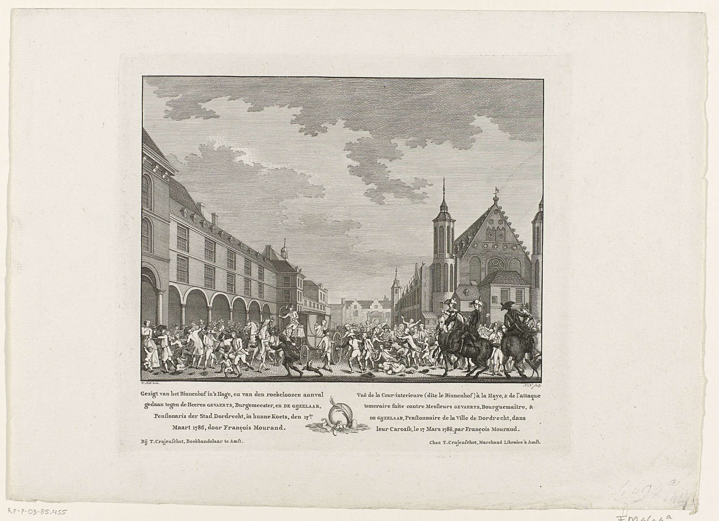 Ongeregeldheden als de gedeputeerden van Dordrecht, de heren Gevaerts en De Gijzelaar, met hun rijtuig door de Stadhouderspoort het Binnenhof op rijden en hun paarden bij de toom worden gegrepen door de Haagse pruikenmaker F. Mourand, 17 maart 1786. In het onderschrift een vignetje en de titels in het Nederlands en Frans.