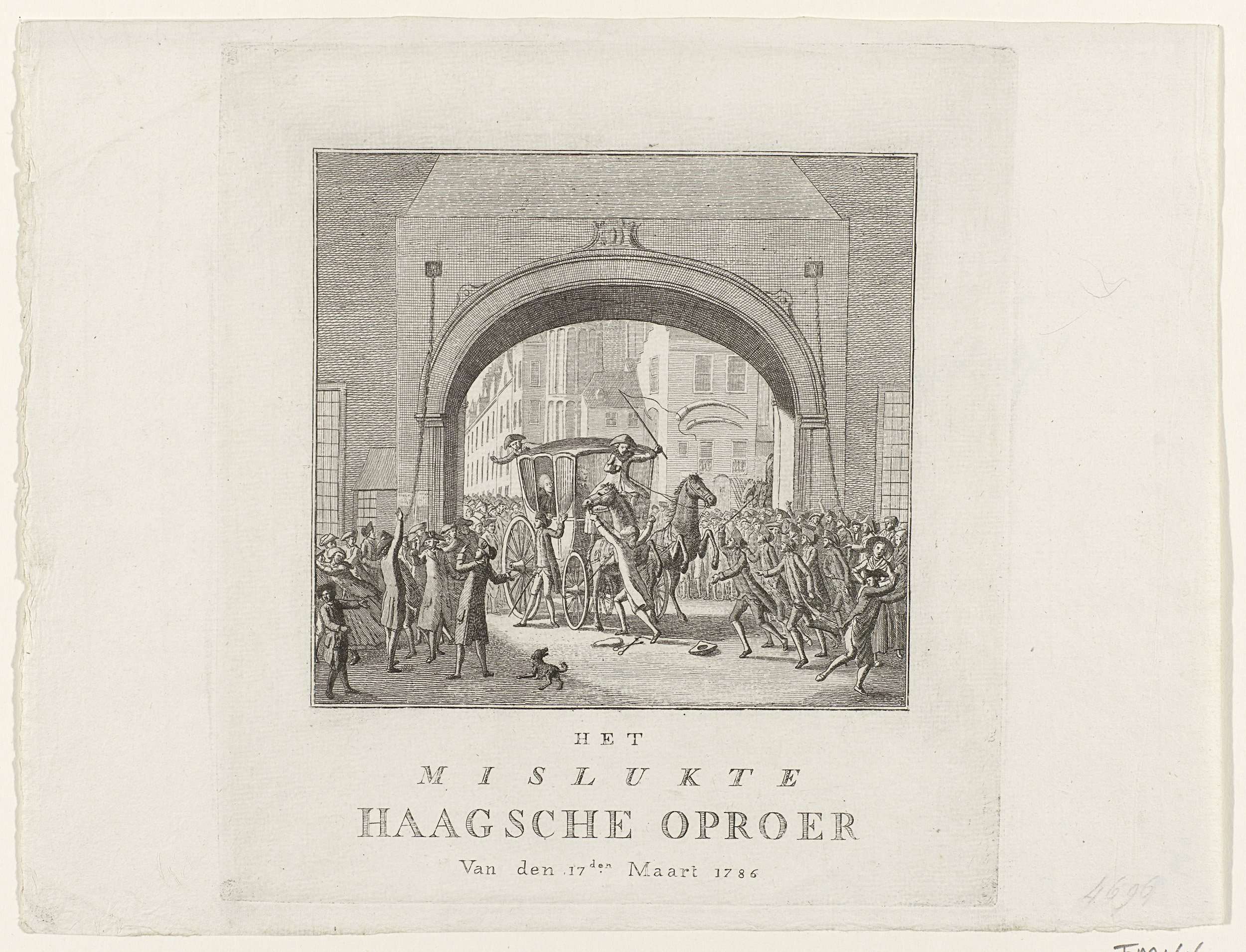 Ongeregeldheden als de gedeputeerden van Dordrecht, de heren Gevaerts en De Gijzelaar, met hun rijtuig door de Stadhouderspoort het Binnenhof op willen rijden en hun paarden bij de toom worden gegrepen door de Haagse pruikenmaker F. Mourand, 17 maart 1786.