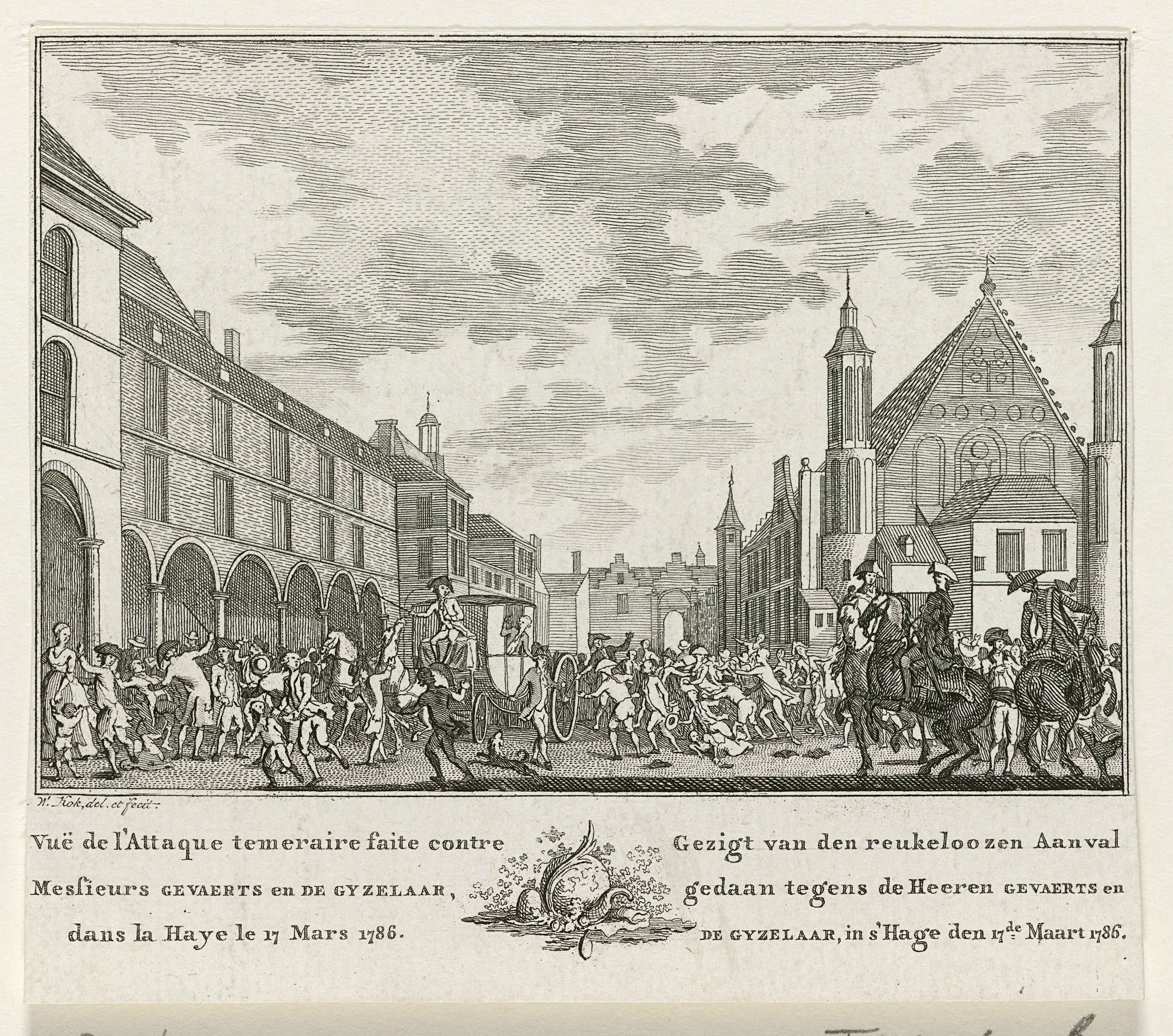 Aanslag door de Haagse pruikenmaker F. Mourand op het rijtuig van de gedeputeerden van Dordrecht, de heren Gevaerts en De Gijzelaar, als zij door de Stadhouderspoort het Binnenhof op willen rijden, 17 maart 1786.