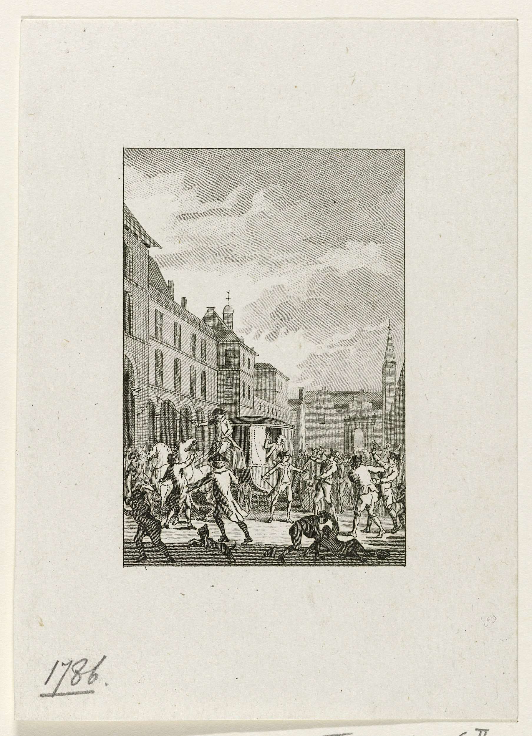Aanslag door de Haagse pruikenmaker F. Mourand op het rijtuig van de gedeputeerden van Dordrecht, de heren Gevaerts en De Gijzelaar, als zij door de Stadhouderspoort het Binnenhof op willen rijden, 17 maart 1786.