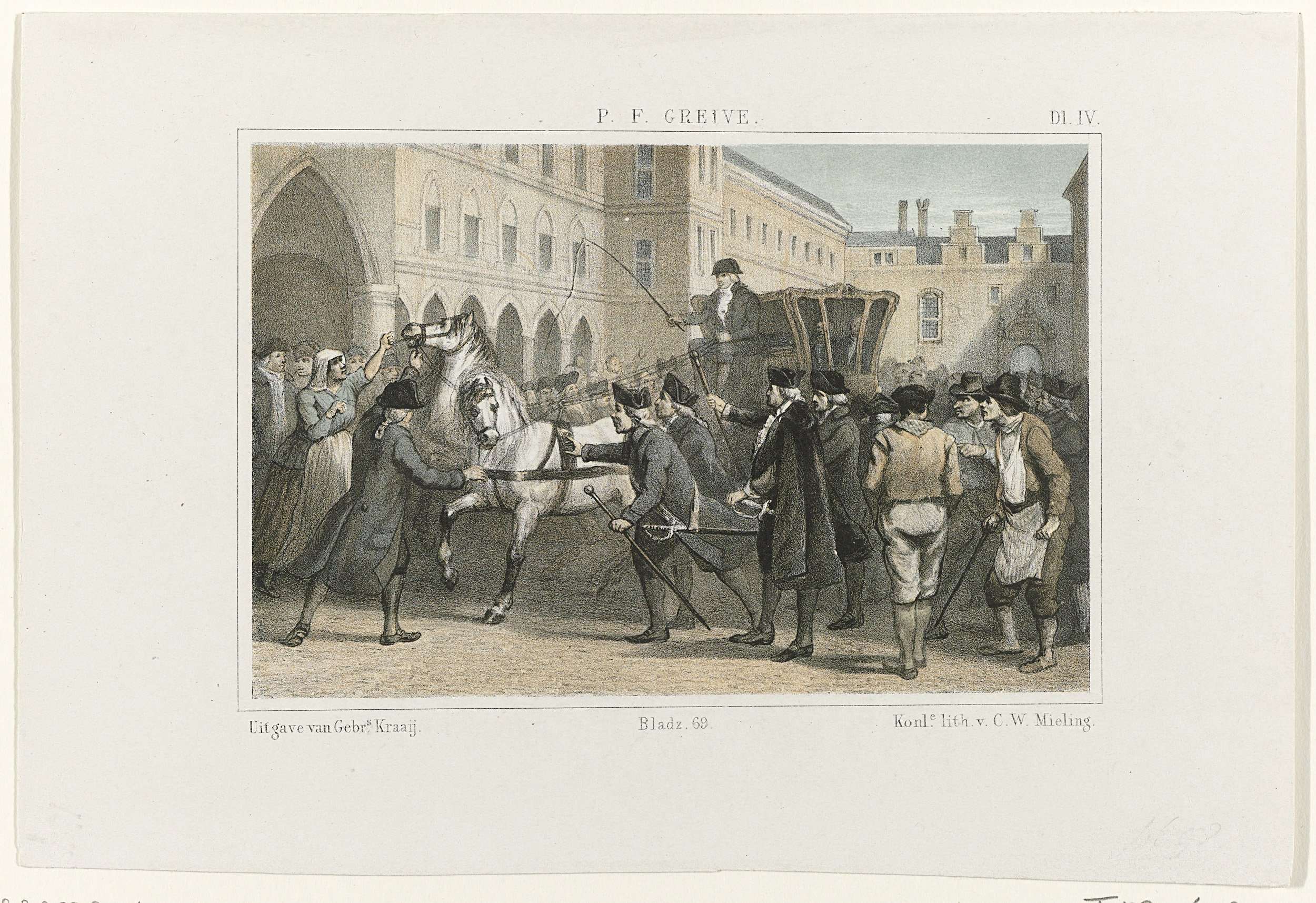 Aanslag door de Haagse pruikenmaker F. Mourand op het rijtuig van de gedeputeerden van Dordrecht, de heren Gevaerts en De Gijzelaar, als zij door de Stadhouderspoort het Binnenhof op willen rijden, 17 maart 1786. Gemerkt: Dl. IV. Bladz. 69.