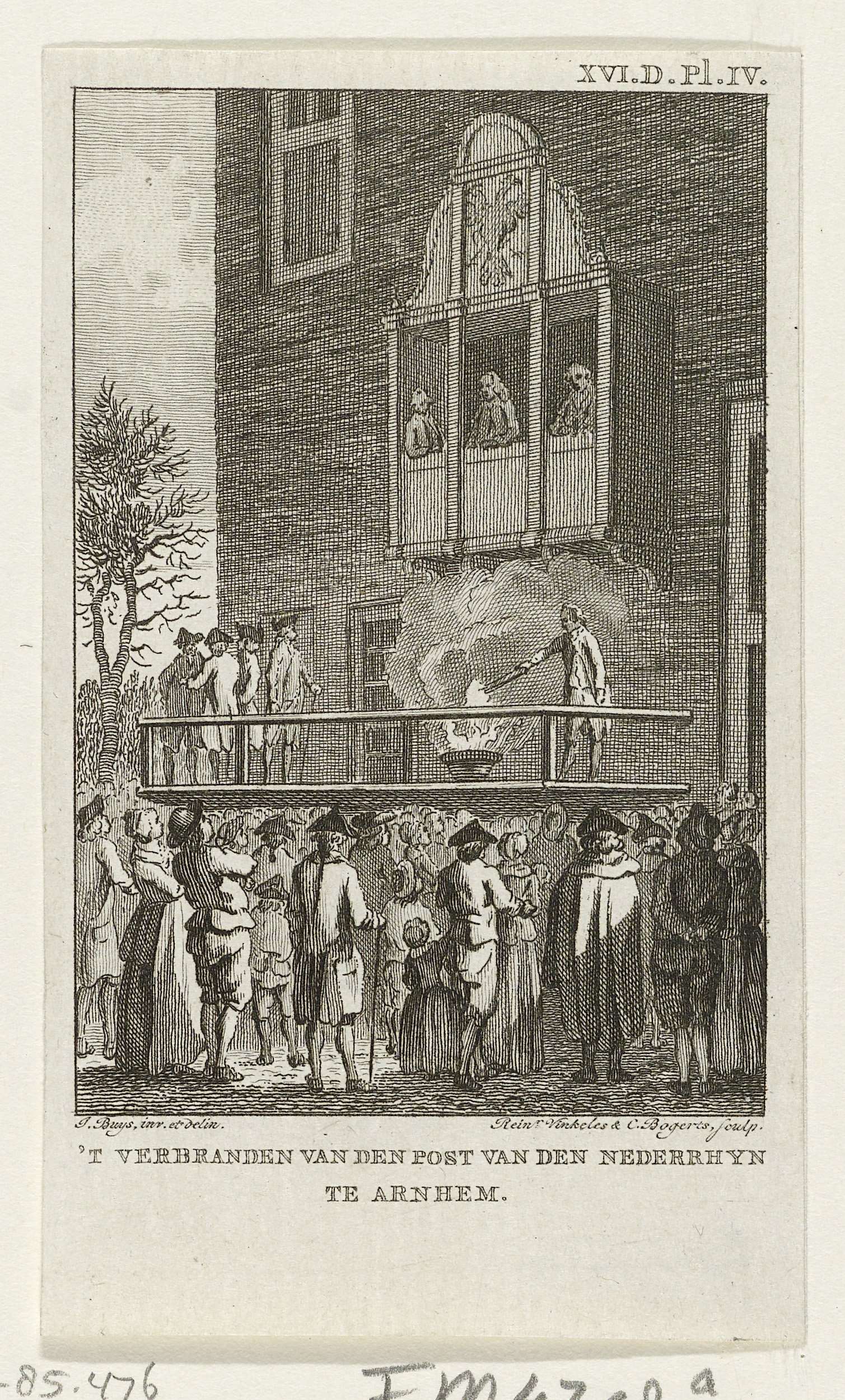 Openbare executie door verbranding door een beul van een exemplaar van het patriotse tijdschrift De Post van den Neder-Rhijn, op een schavot voor het oude stadhuis van Arnhem, 22 april 1786. Actie door tegenstanders van het blad waarin de vrijlating van de van moord beschuldigde korporaal van Douglas werd veroordeeld. Gemerkt bovenaan: XVI.D.Pl.IV.