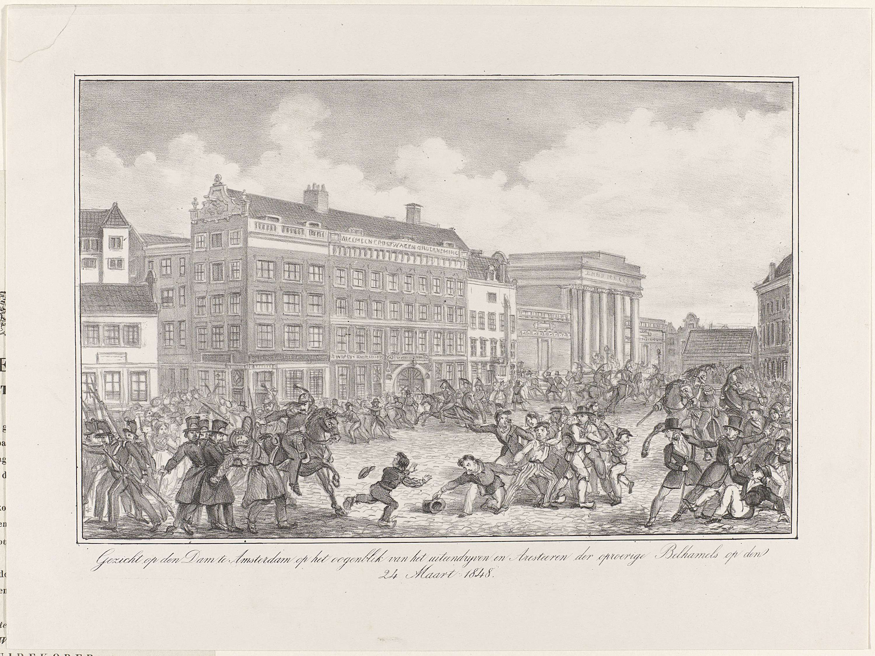Gezicht op den Dam te Amsterdam op het oogenblik van het uiteendryven en Aresteeren der oproerige Belhamels op den 24 Maart 1848