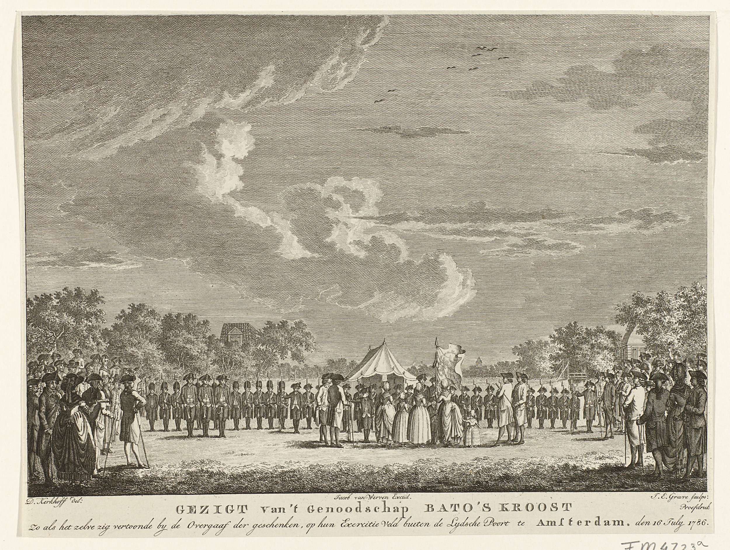 Plechtige overdracht van de geschenken van de vaandel, trom en geweren aan het Amsterdamse exercitiegenootschap Bato's Kroost, op het exercitieterrein buiten de Leidsepoort te Amsterdam, 16 juli 1786. De geschenken aangereikt door enkele dames, donatrices, aan de vaandrigs van de schutterij. Op de achtergrond de opgestelde schutters.