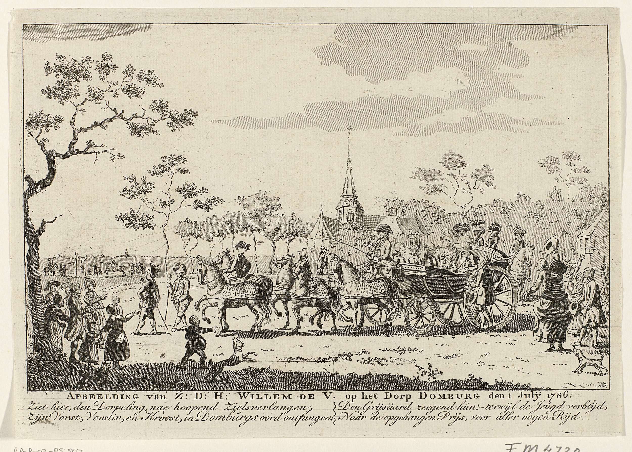 Tijdens hun bezoek aan Zeeland wordt de koets met prins Willem V, prinses Wilhelmina van Pruisen en hun kinderen ingehaald door de inwoners van het dorp Domburg, 1 juli 1786. Ter gelegenheid van het bezoek worden volksspelen gehouden. In het onderschrift een vierregelig lofvers op het vorstelijk gezin.