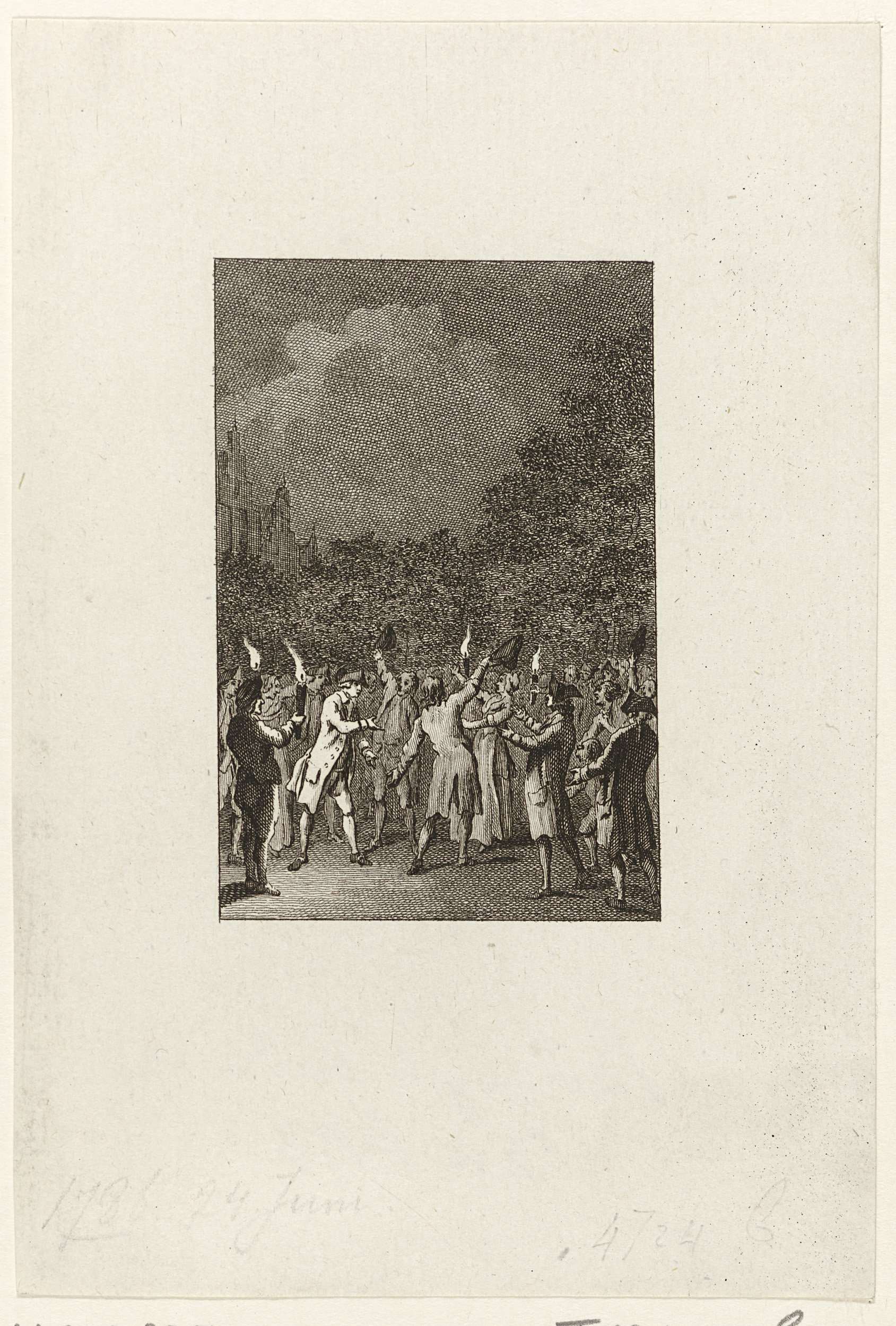 Onrust op straat, verschillende personen met toortsen, te Dordrecht op 21 augustus 1786.