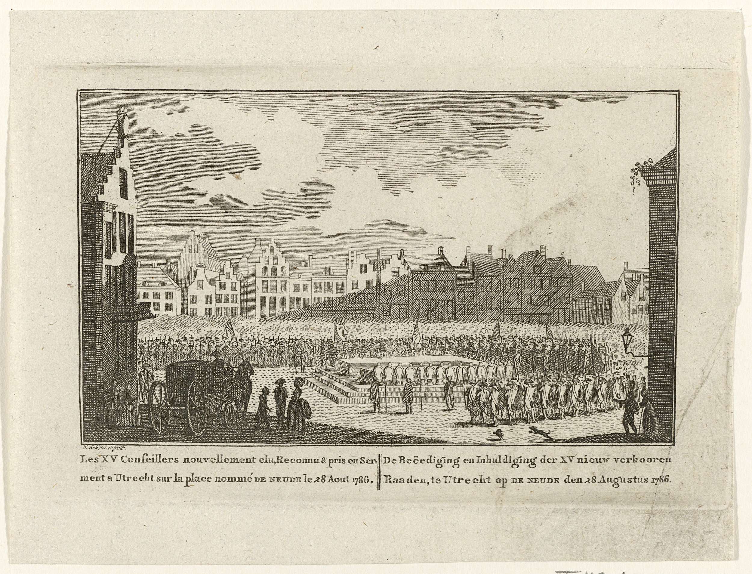 Ceremoniële beëdiging en inhuldiging van de 15 nieuw gekozen Utrechtse raden of vroedschappen op de Neude te Utrecht, 28 augustus 1786. In het onderschrift de titels in het Frans en Nederlands.