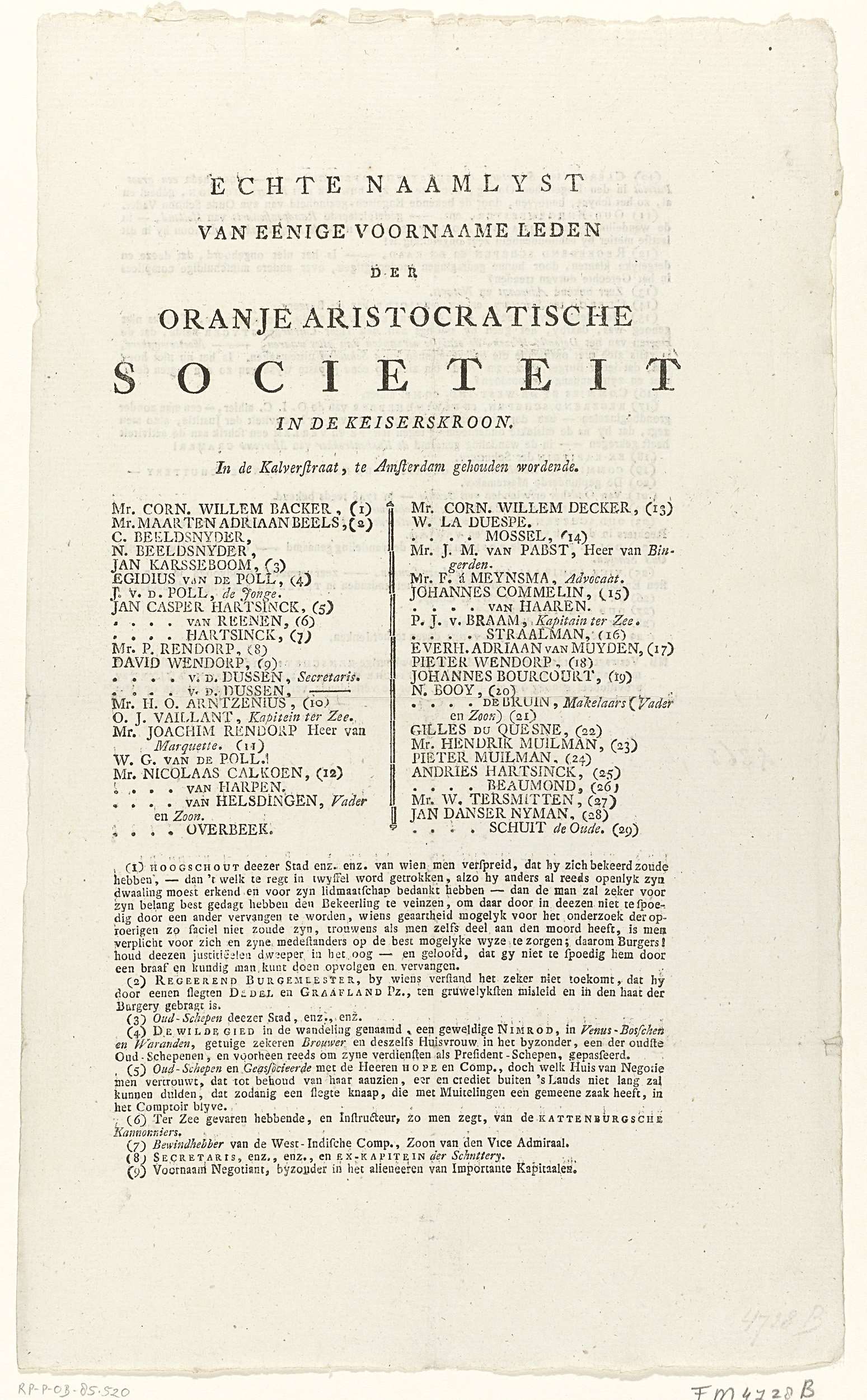 Tekstblad met een naamlijst van de leden van de Oranje Aristocratische Sociëteit die bijeen komt in de Keiserskroon in de Kalverstraat te Amsterdam, ca. 1786. Blad bedrukt op beide zijden met de lijst met namen en noten met opmerkingen over deze personen.