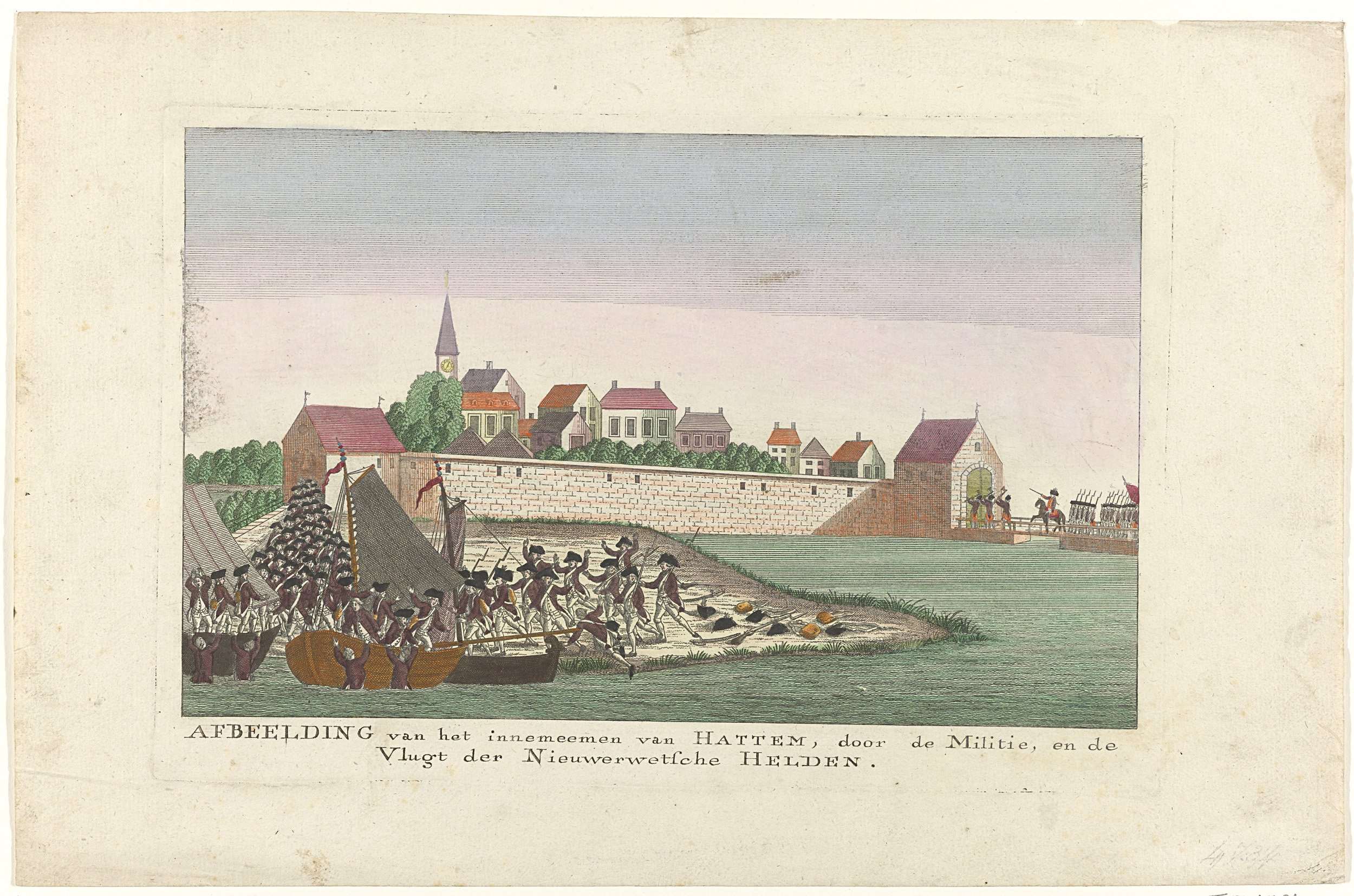 Inname van de stad Hattem door de stadhouderlijke troepen onder generaal-majoor J.C. Spengler op 6 september 1786, links vluchten de patriotten uit de stad naar boten in de IJssel.
