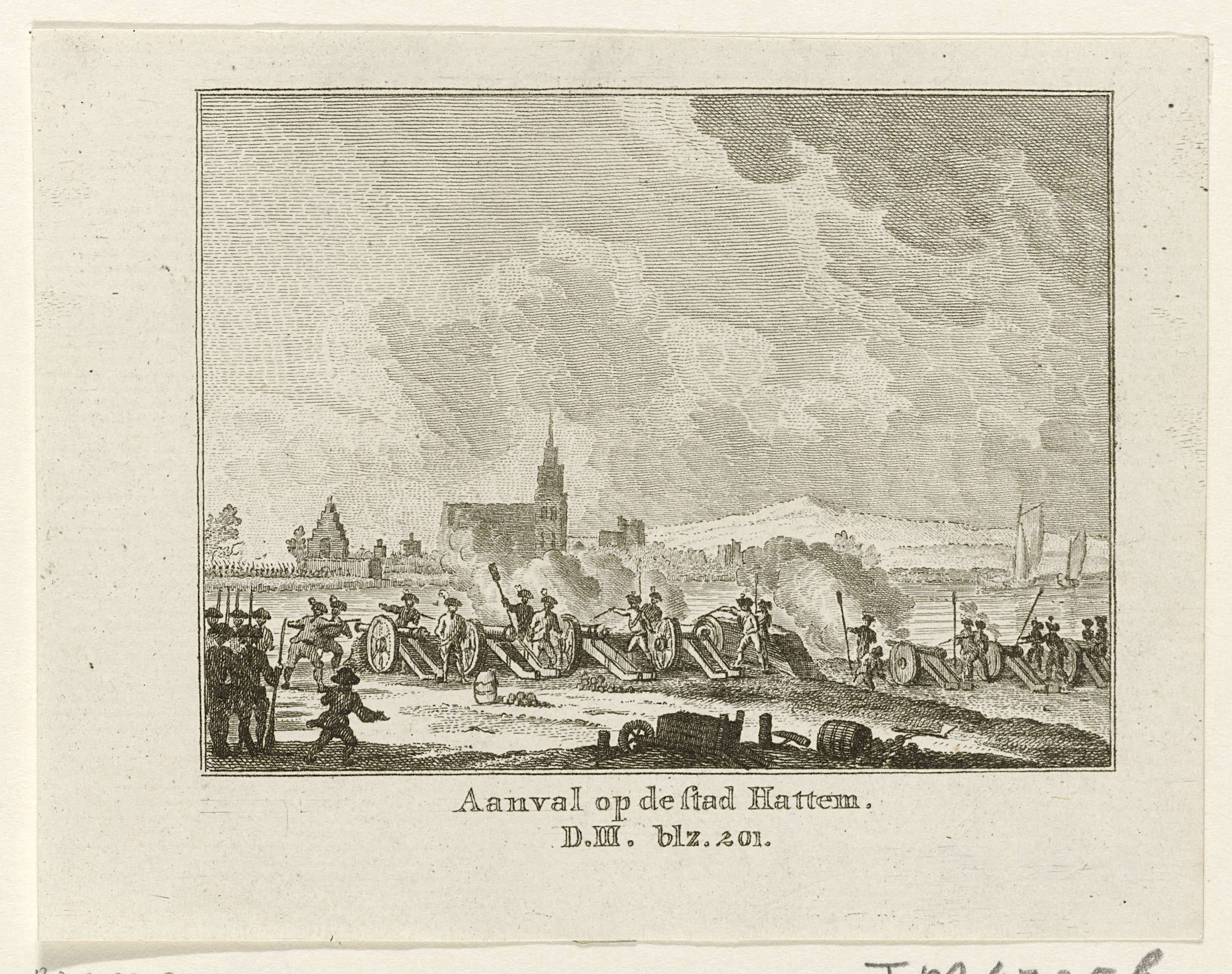 Beschieting van de stad Hattem door de stadhouderlijke troepen onder generaal-majoor J.C. Spengler op 5 september 1786. Gemerkt onderaan: D.III. blz.201.