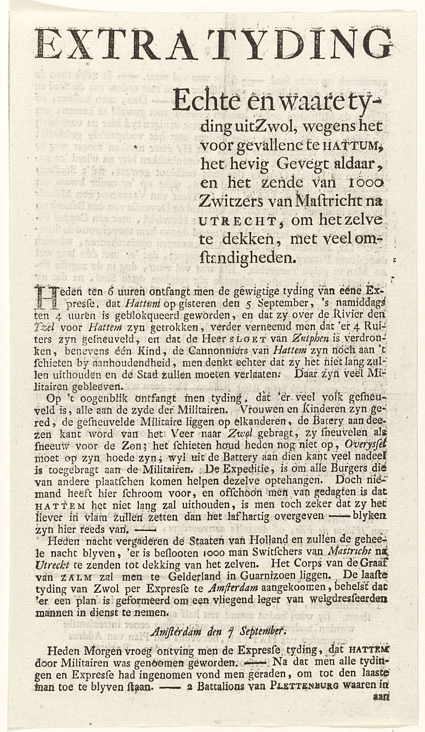 Patriots nieuwsbericht van 7 september over de beschieting van Hattem door de stadhouderlijke troepen op 5 september 1786. Blad bedrukt op beide zijden.