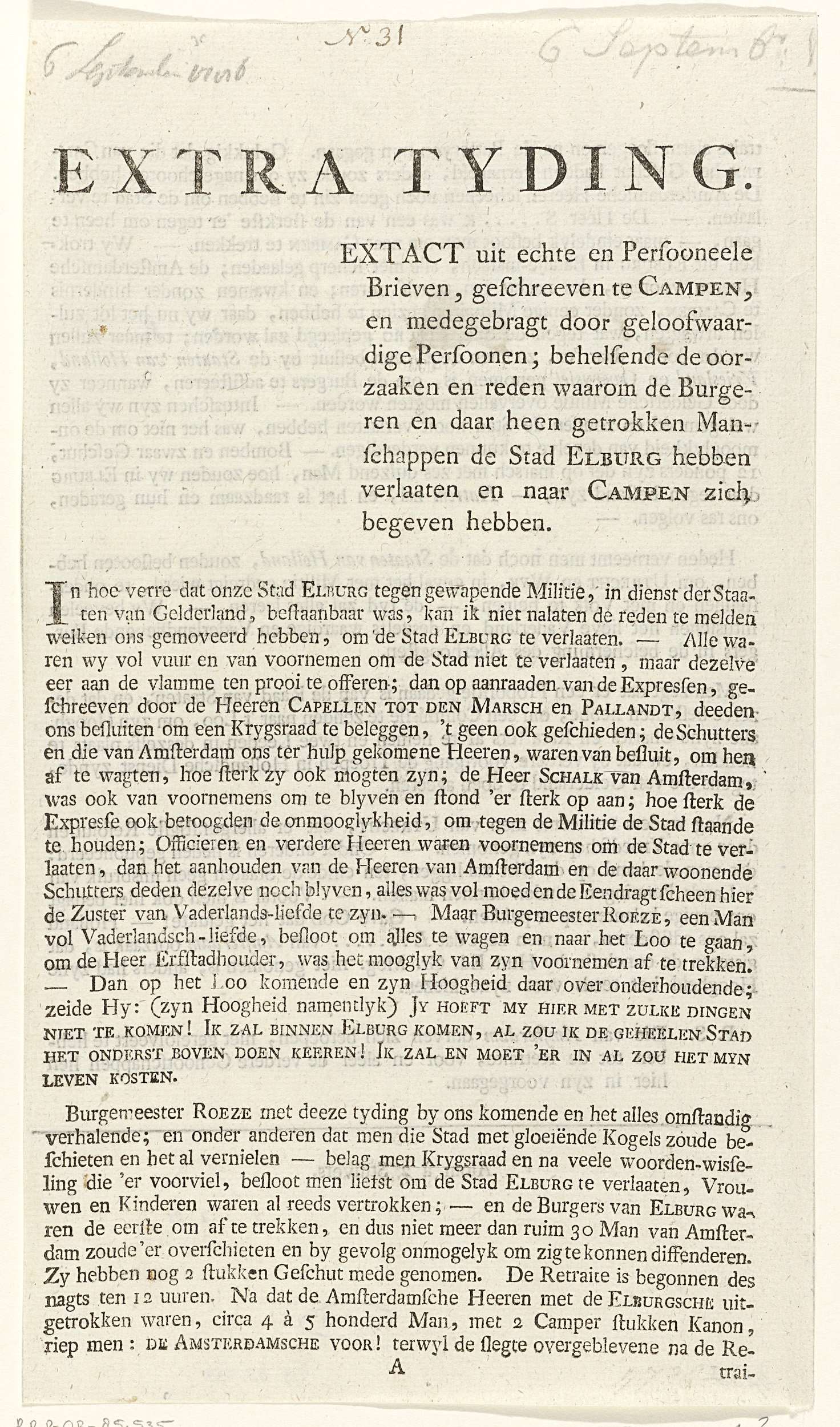 Patriots nieuwsbericht over de evacuatie van burgers en manschappen uit Elburg naar Kampen op 4 september 1786. Blad bedrukt op beide zijden.