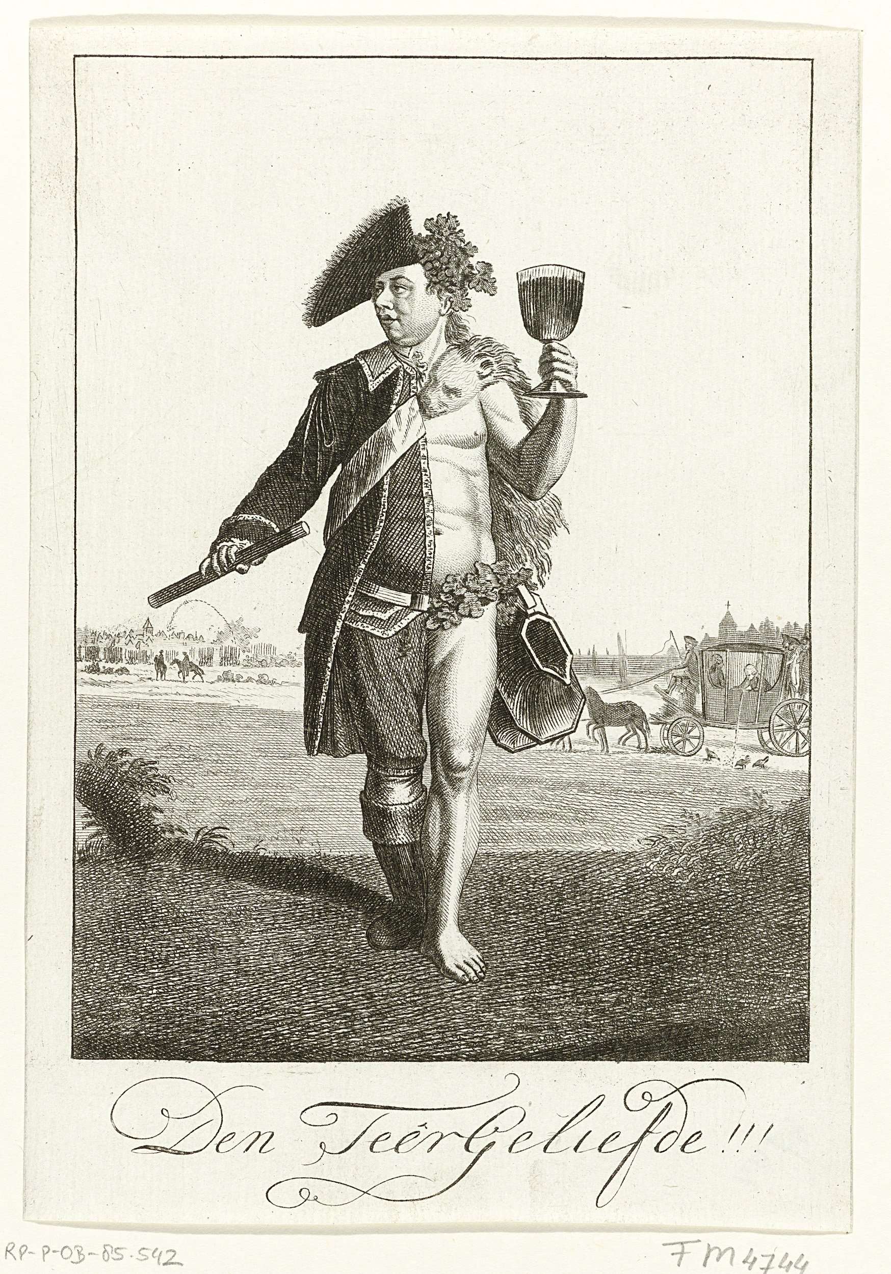 Stadhouder Willem V wijst met zijn commandostaf naar de beschieting van Hattem in 1786. Deze onnodig wrede aanval werd door tijdgenoten afgekeurd. Zijn uiterlijk als Bacchus, god van de wijn, symboliseert zijn losbandige levensstijl. In die tijd was dit een veelgehoorde klacht over het gedrag van de adel. In de verte hangt de prins brakend ...