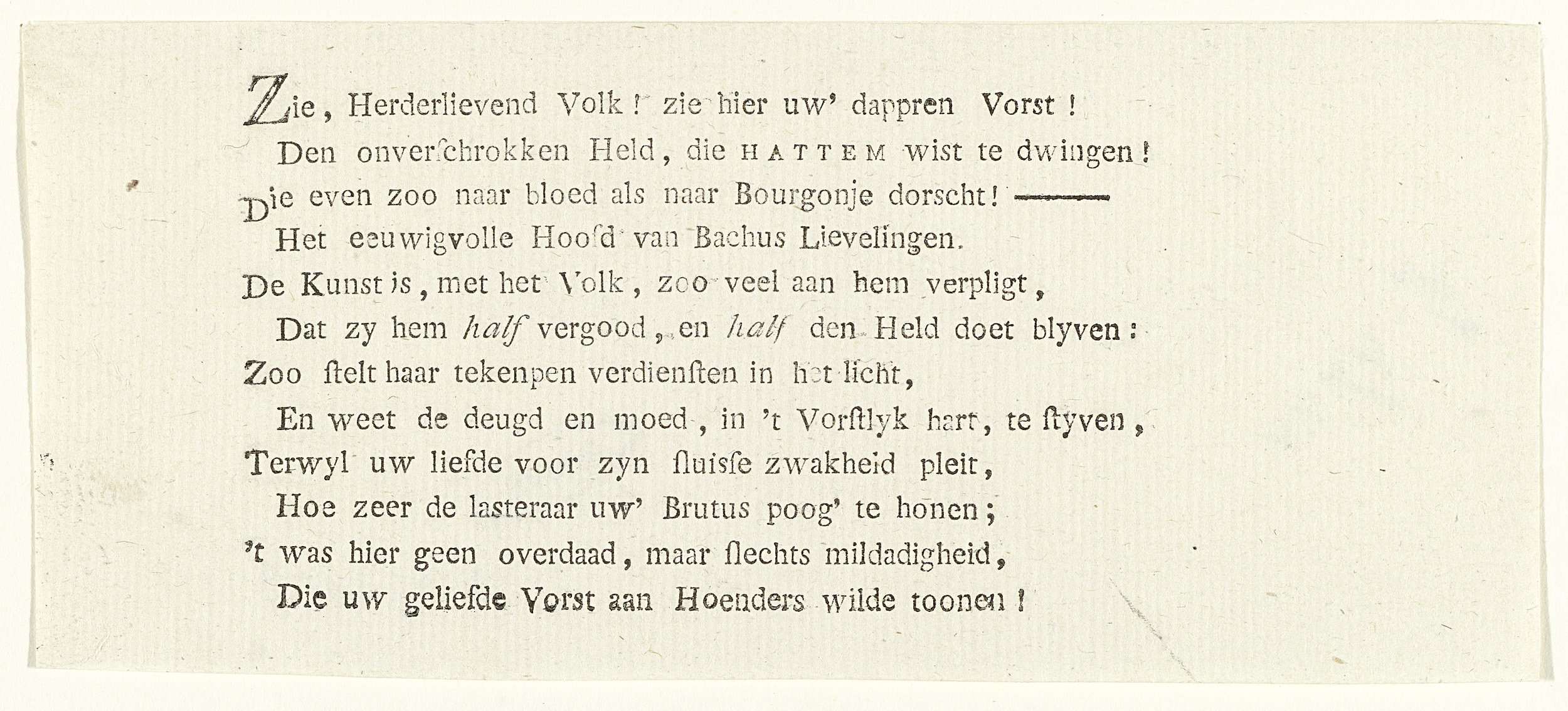 Blaadje met een vers van twaalf regels behorend bij de spotprent op stadhouder Willem V, voorgesteld half als militair met commandostaf in de ene hand en half als Bacchus met een glas wijn in de andere hand.