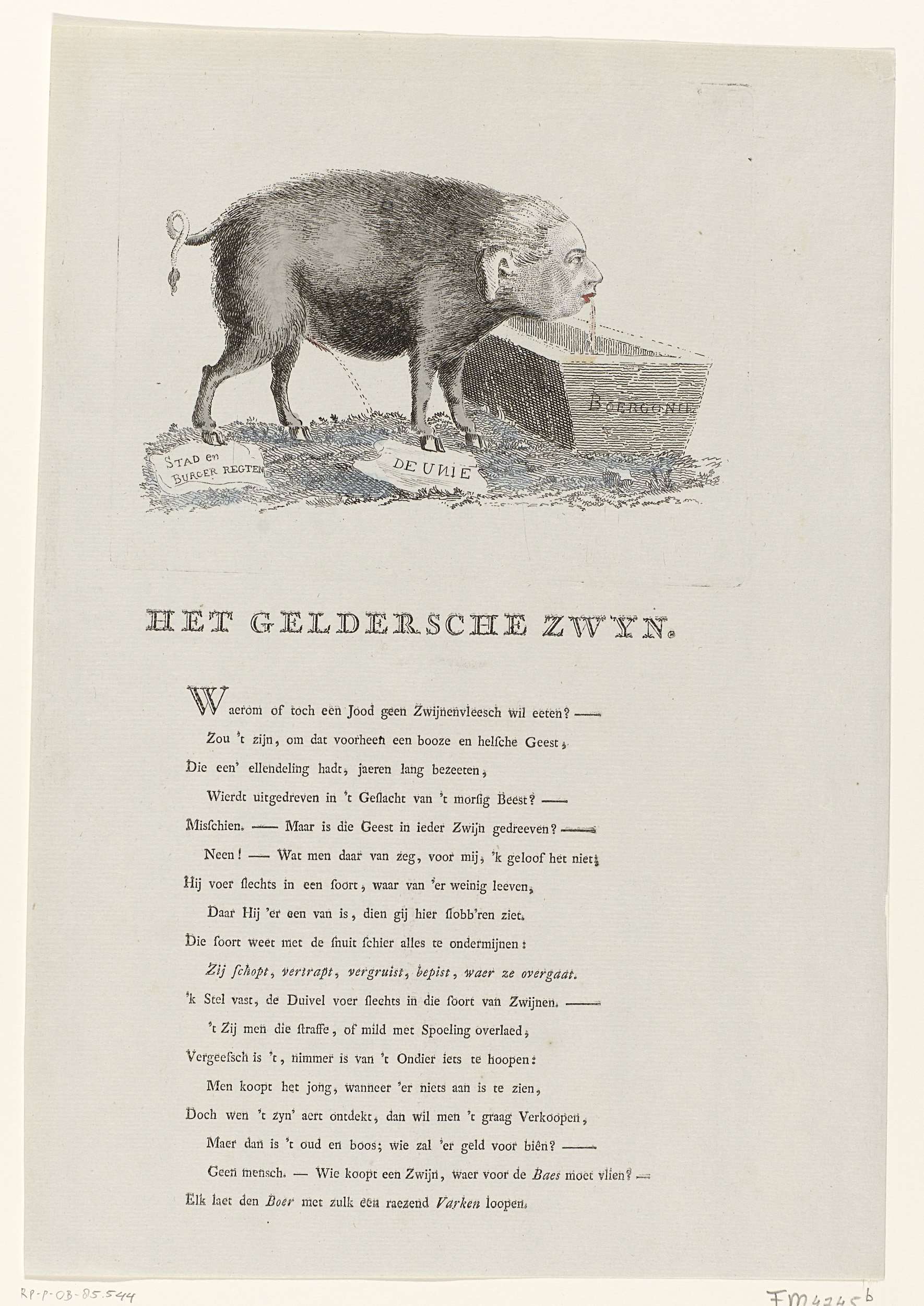 Spotprent op stadhouder Willem V, 1786. De prins afgebeeld als een zwijn dat drinkt uit een bak met Bourgogne wijn en tegelijkertijd spuugt, de stads- en burgerrechten vertreedt en urineert op de Unie. Op het blad onder de plaat een vers van 18 regels.