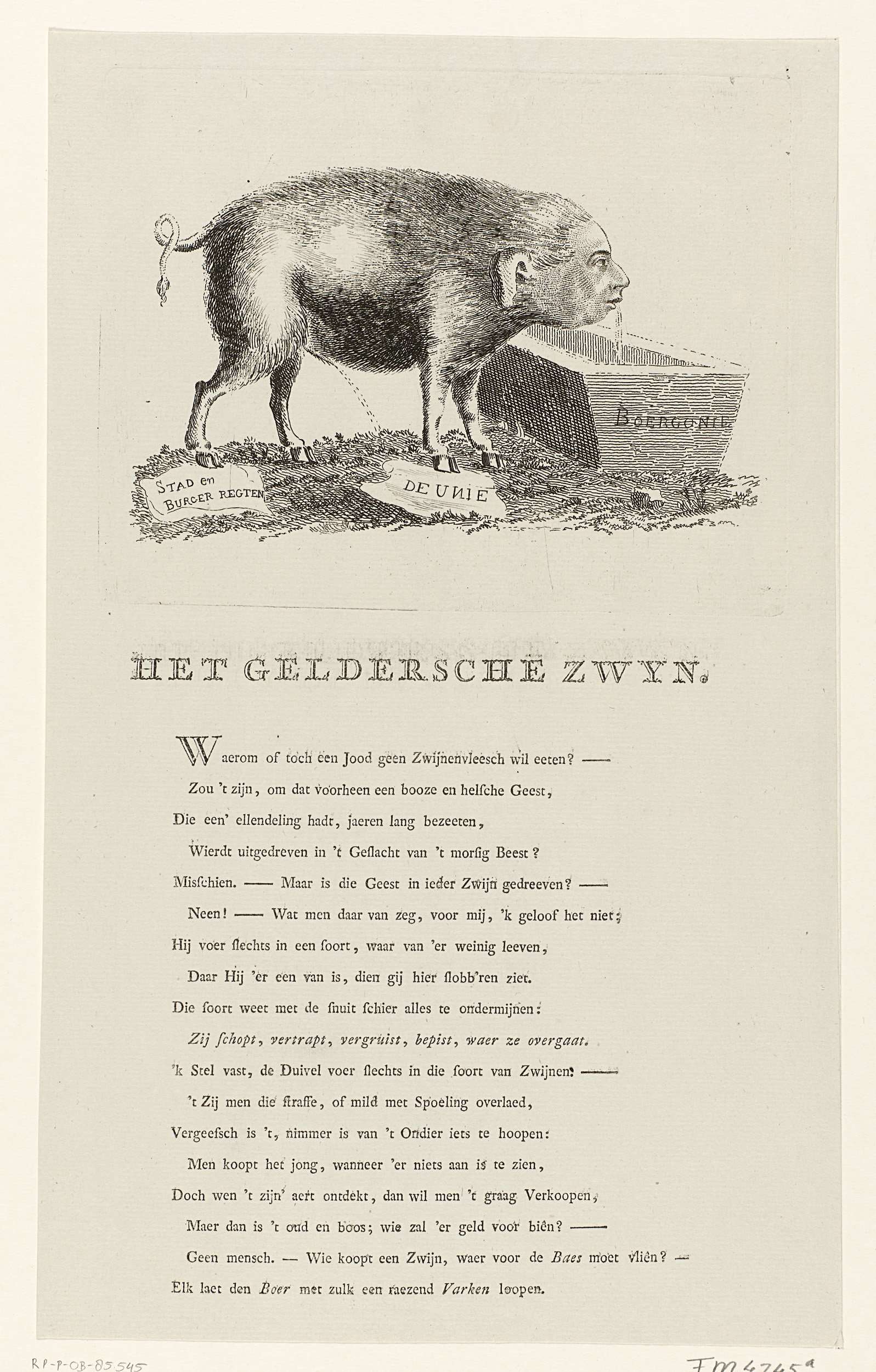 Spotprent op stadhouder Willem V, 1786. De prins afgebeeld als een zwijn dat drinkt uit een bak met Bourgogne wijn en tegelijkertijd spuugt, de stads- en burgerrechten vertreedt en urineert op de Unie. Op het blad onder de plaat een vers van 18 regels.