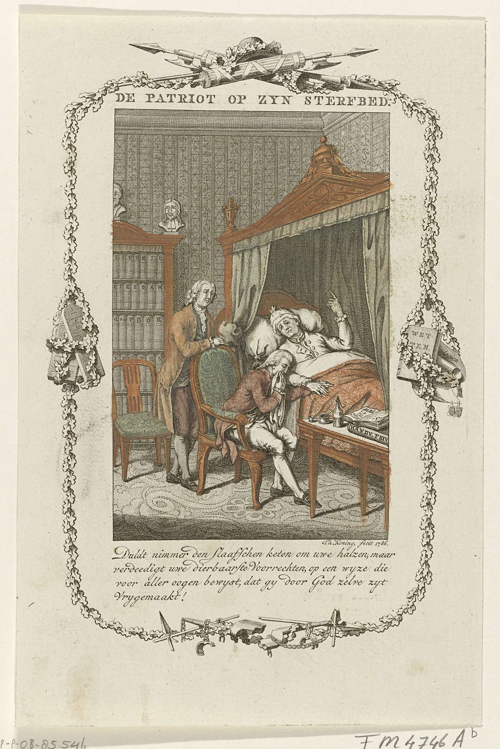 Een stervende man vermaant op zijn sterfbed zijn zoon om nooit de keten van slavernij te dulden maar om je verworven voorrechten en vrijheden te verdedigen. Voorstelling binnen een ornamentale kader met wetboeken, pijlenbundels, gebroken juk en speer en eikenbladeren. Met vierregelig onderschrift.