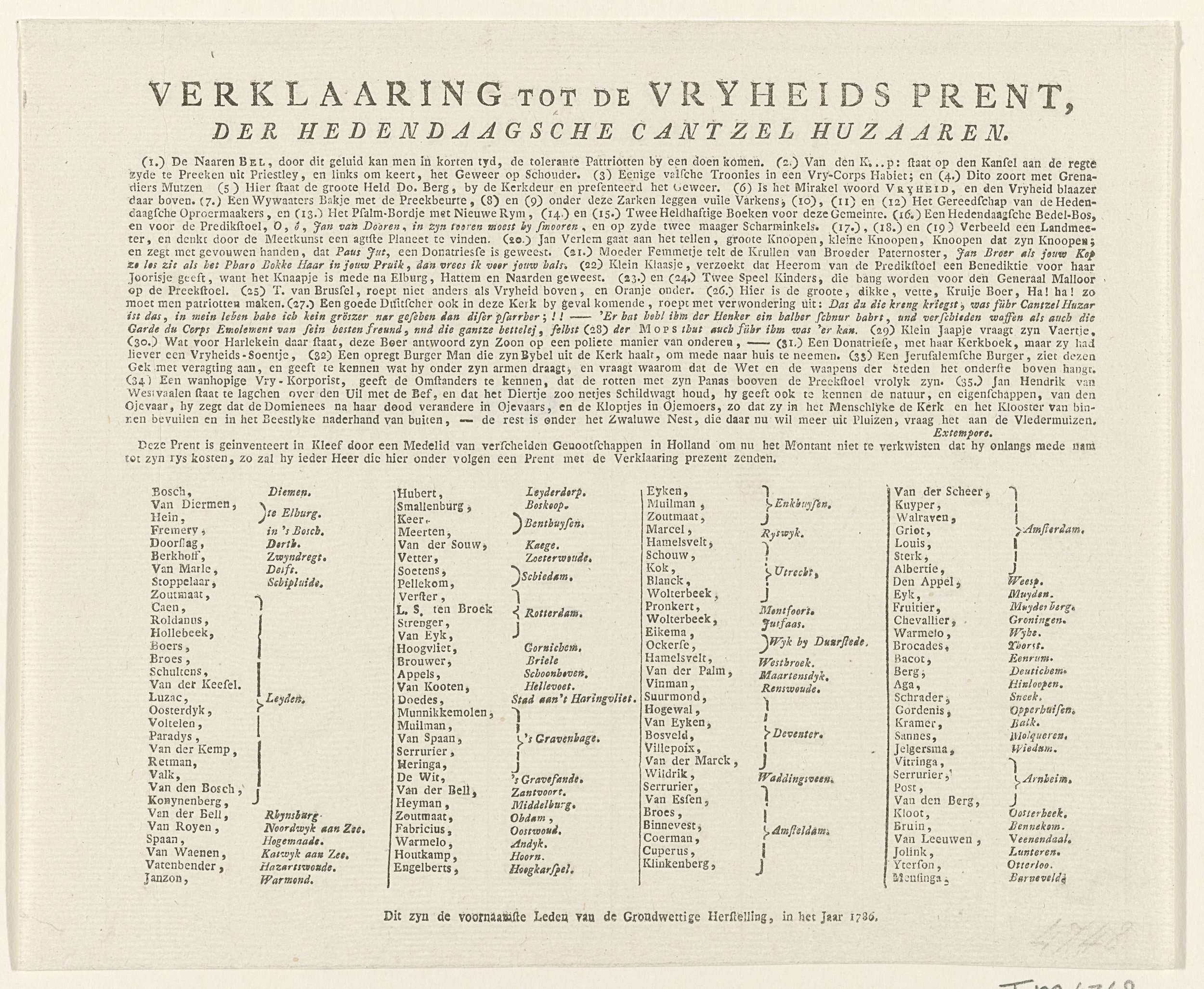 Tekstblad met een verklaring van de voorstelling van de Orangistische spotprent op de patriotse Leidse doopsgezinde predikant François Adriaan van der Kemp. Onder de legenda een lijst van patriotse predikanten in verschillende steden.