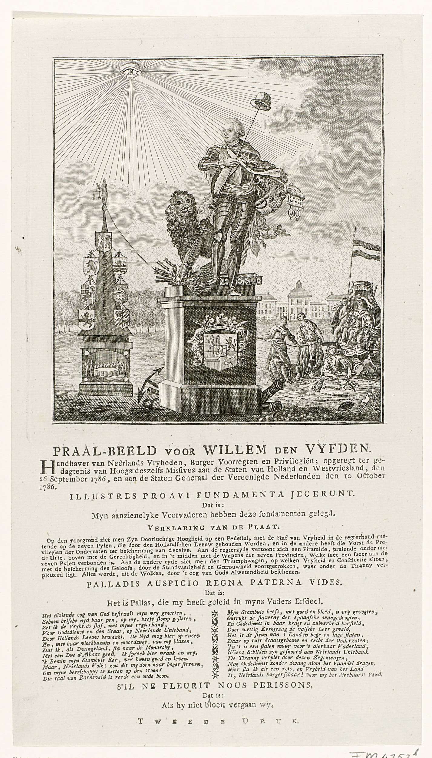 Allegrorisch standbeeld ter ere van van stadhouder Willem V, naar aanleiding van zijn missieven aan de Staten van Holland en West-Friesland van 26 september 1786 en aan de Staten-Generaal van 10 oktober 1786 (Tweede druk). Beeld van de prins in wapenrusting met speer en vrijheidshoed en privileges van het volk, achter hem de Nederlandse Leeuw. ...
