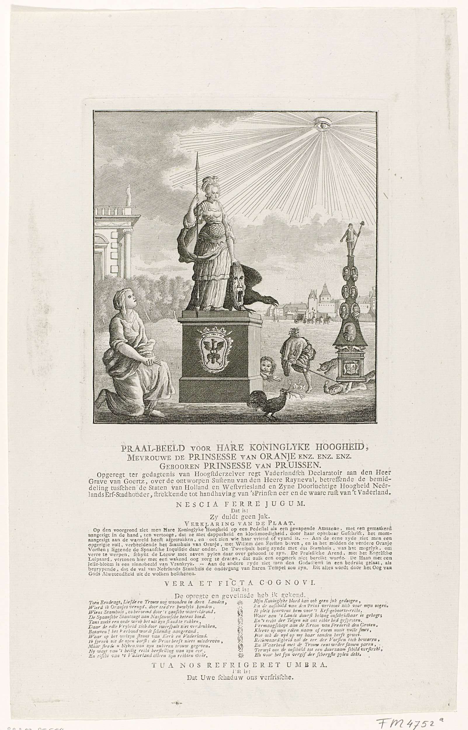 Allegrorisch standbeeld ter ere van van prinses Wilhelmina van Pruisen, naar aanleiding van de bemiddeling tussen de Staten van Holland en West-Friesland en de erfstadhouder, 1786. Beeld van de prinses als een gewapende Amazone. Rechts een monument met de vorsten uit het stamhuis van Oranje, links knielt de Godsdienst. In de hemel het Alziende Oog. ...