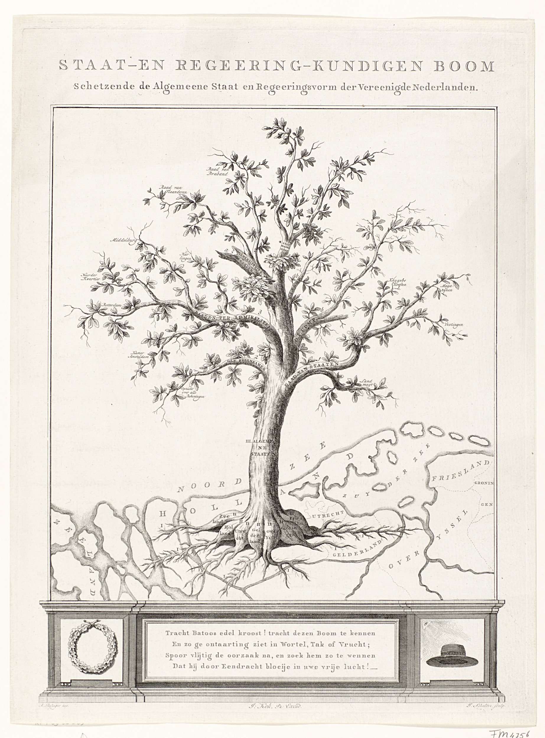 Een kaart van de Verenigde Nederlanden waaruit een boom groeit als symbool van de staatsvorm en regeringsvorm in de Republiek, 1786. Onderaan een voetstuk met een vierregelig vers, links een krans van eikenbladeren en rechts de vrijheidshoed. Bij de prent behoort een blad met een verklaring.