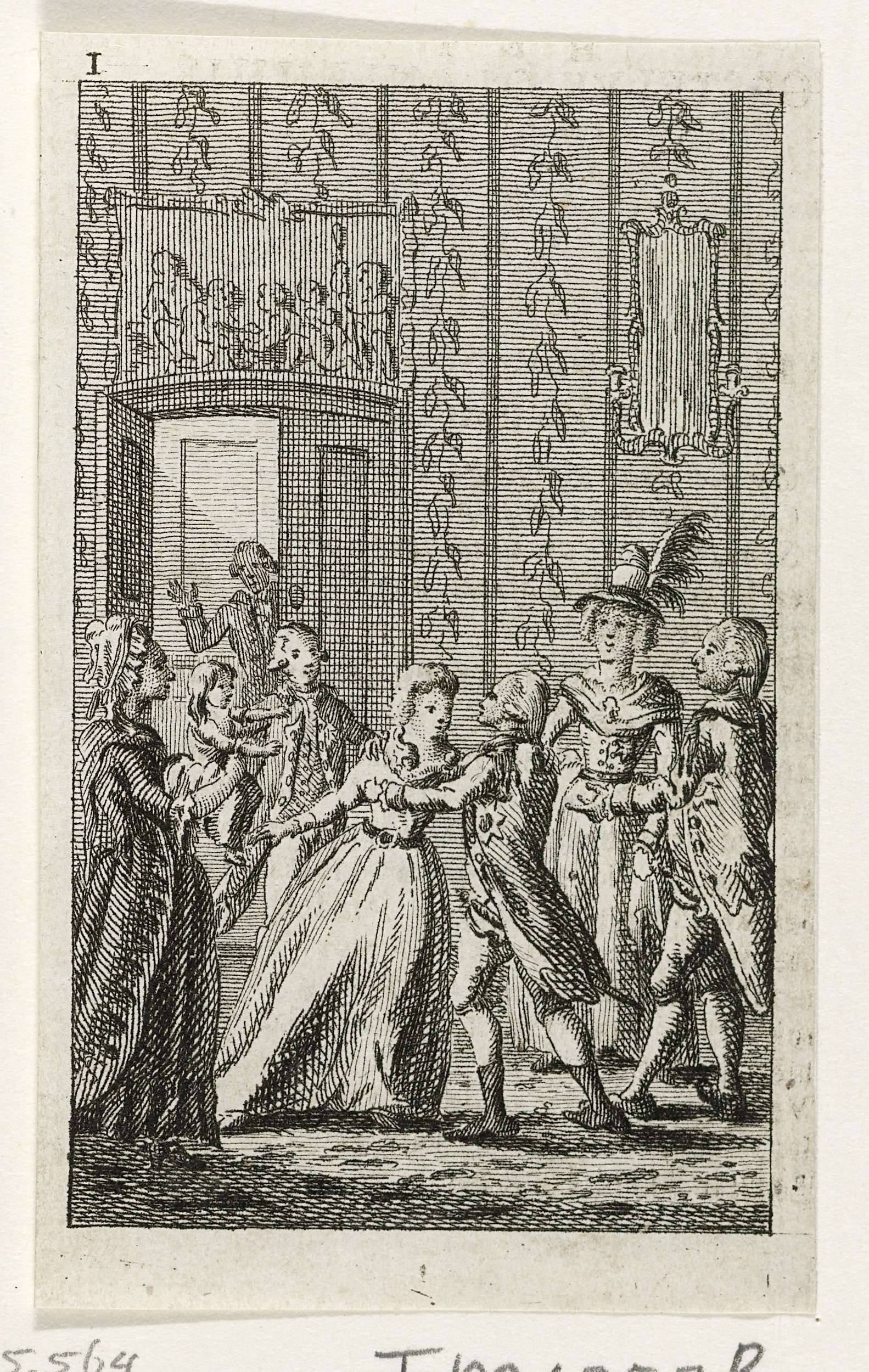 Interieur met een vorst die afscheid neemt van zijn gezin, onderdeel van een groep van 6 plaatjes uit een almanak van ca. 1786. Gemerkt bovenaan: I.