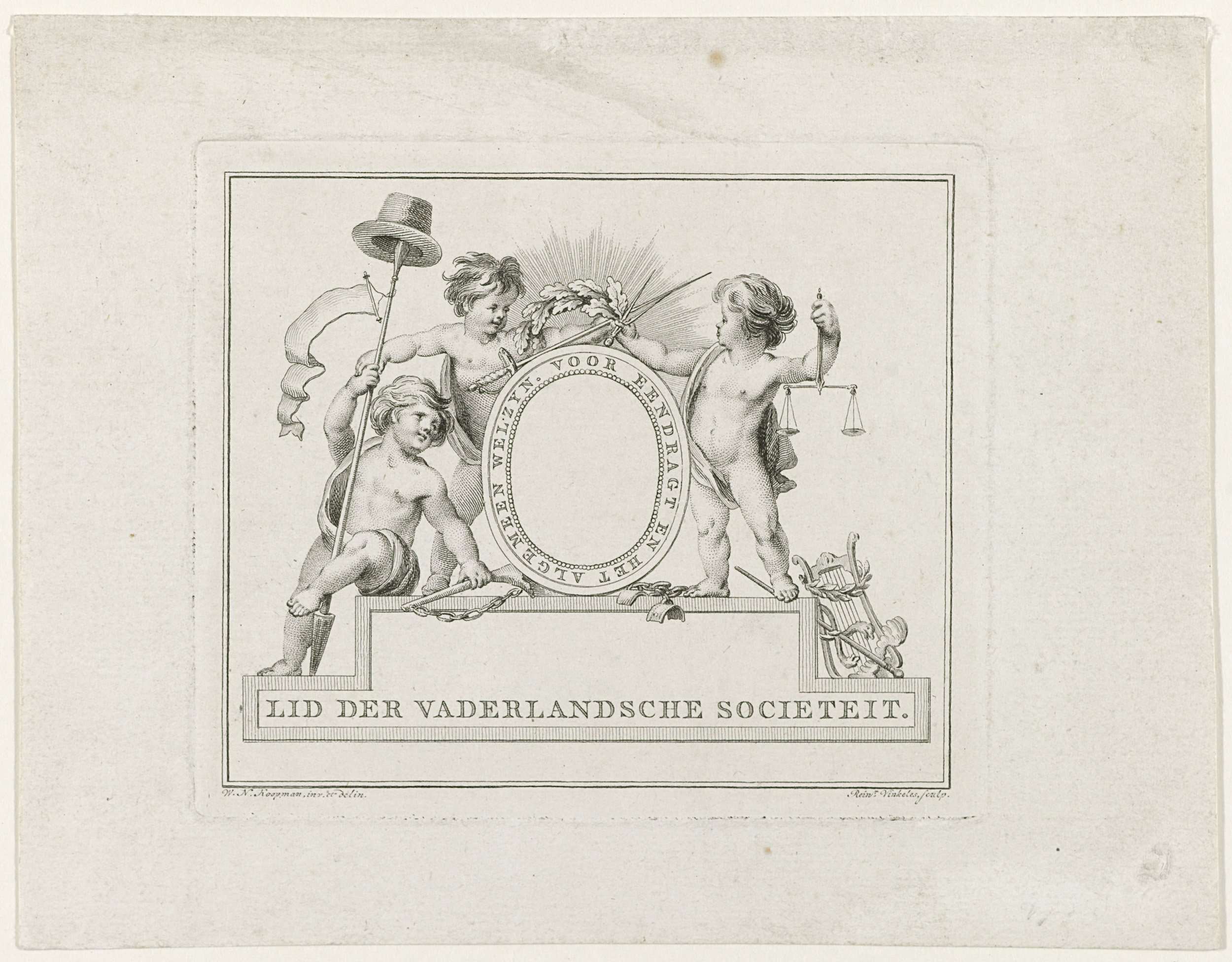 Proefdruk van een lidmaatschapskaart voor de Vaderlandsche Sociëteit te Utrecht, opgericht 1795. Drie putti rond een medaillon met de zinspreuk "Voor Eendragt en het Algemeen Welzyn". De putti dragen als attributen de speer met vrijheidshoed, weegschalen van de Rechtvaardigheid en zwaard met krans van eikenbladeren.