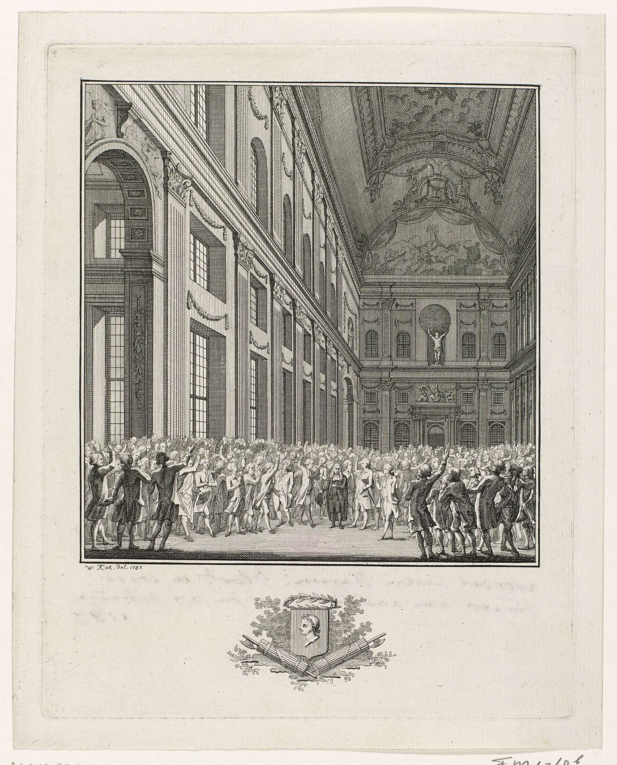 De Amsterdamse burgemeester Hendrik Danielsz. Hooft spreekt in de Burgerzaal van het Stadhuis de samengestroomde burgers toe en verzekert hen de belangen van de stad en het vaderland te zulllen verdedigen, 26 februari 1787. In de marge het wapen van Hooft.