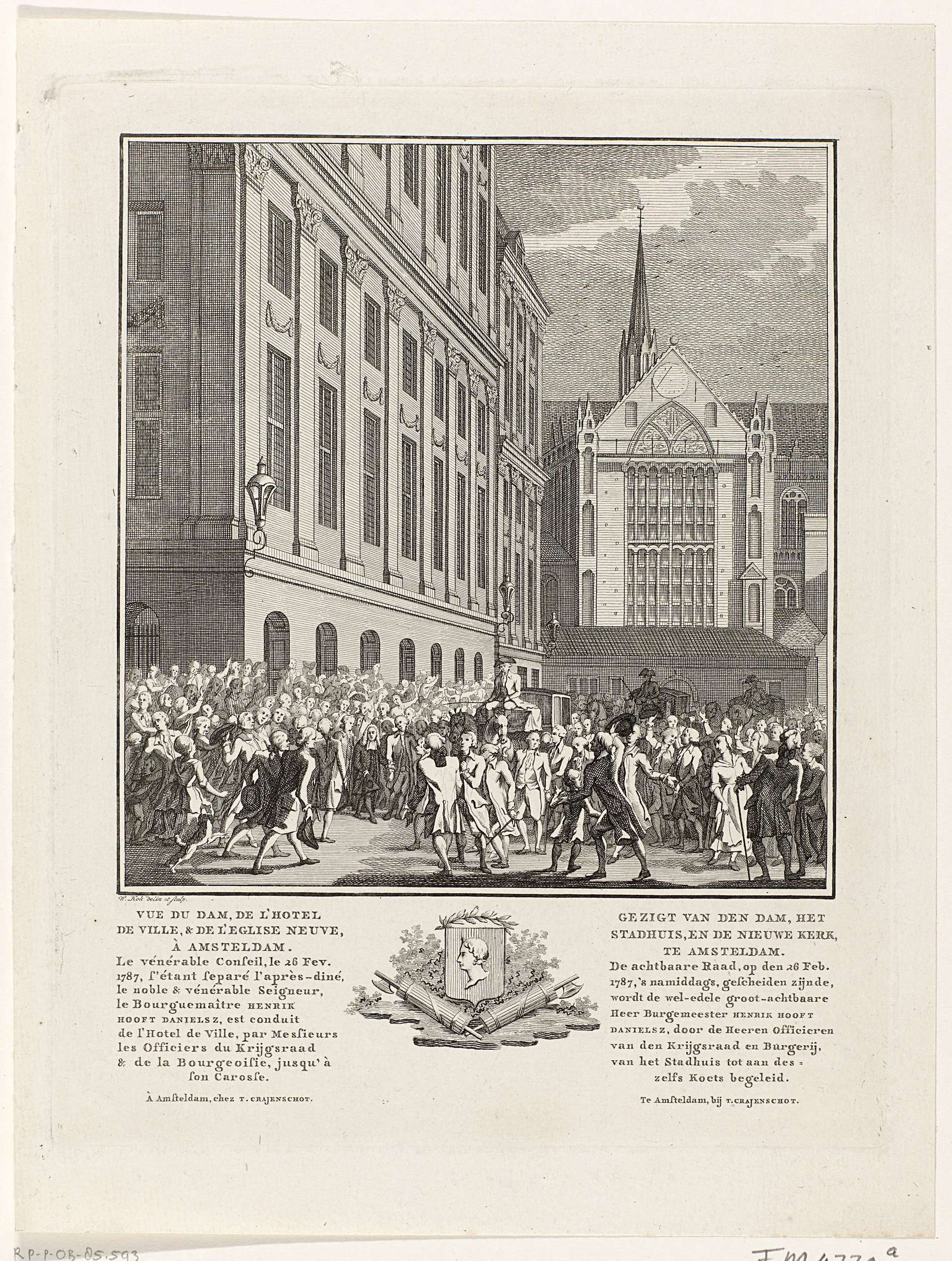De Amsterdamse burgemeester Hendrik Danielsz. Hooft wordt bij vertrek in zijn rijtuig toegejuicht door het publiek op de Dam, 26 februari 1787. In de marge de titels in het Frans en Nederlands aan weerszijden van het wapen van Hooft.