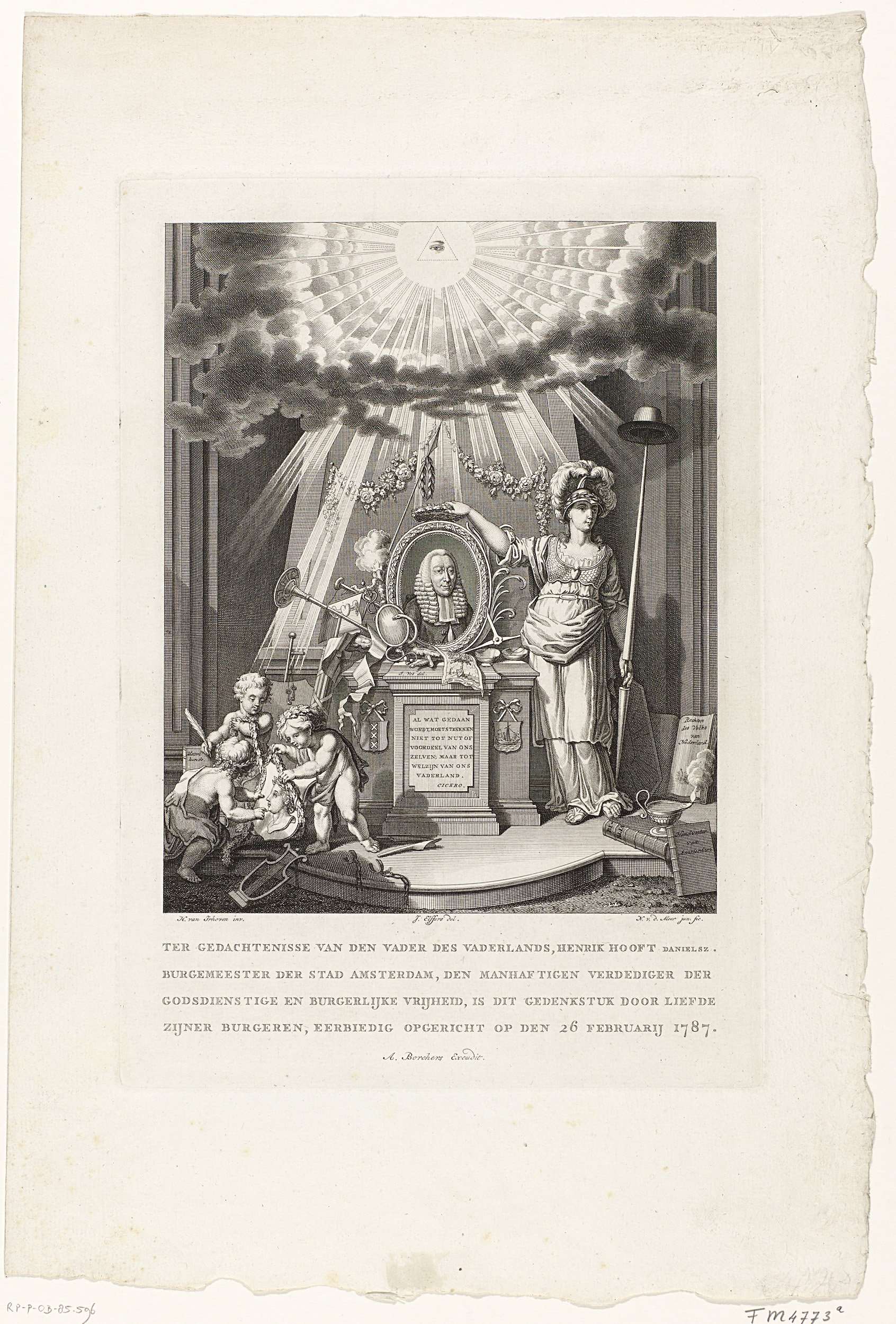 Allegorisch monument voor de Amsterdamse burgemeester Hendrik Danielsz. Hooft, naar aanleiding van zijn verdediging van de patriotse belangen in de raad op 26 februari 1787. Portretmedaillon op voetstuk, bekroond met krans door de Vrijheid, links omhangen drie putti eikenloof om het wapen van Hooft. Bovenaan het stralende Alziende Oog. Bij de prent behoort een verklaring.