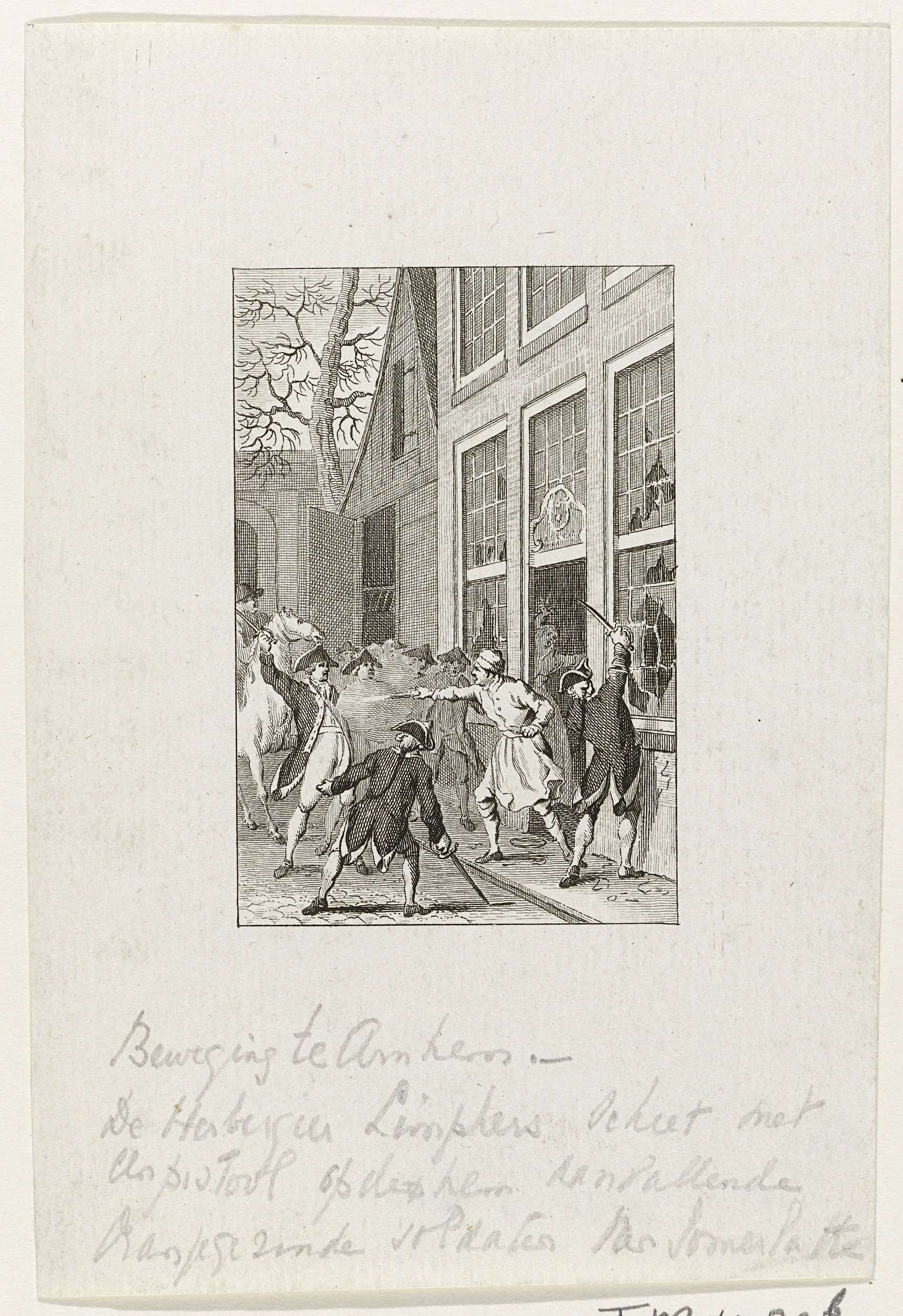 Onrust te Arnhem. De herbergier Limphers in de Roggestraat bij de Velperpoort te Arnhem schiet met een pistool op de hem aanvallende Oranjegezinde soldaten van Somerlatte, 12 maart 1787.