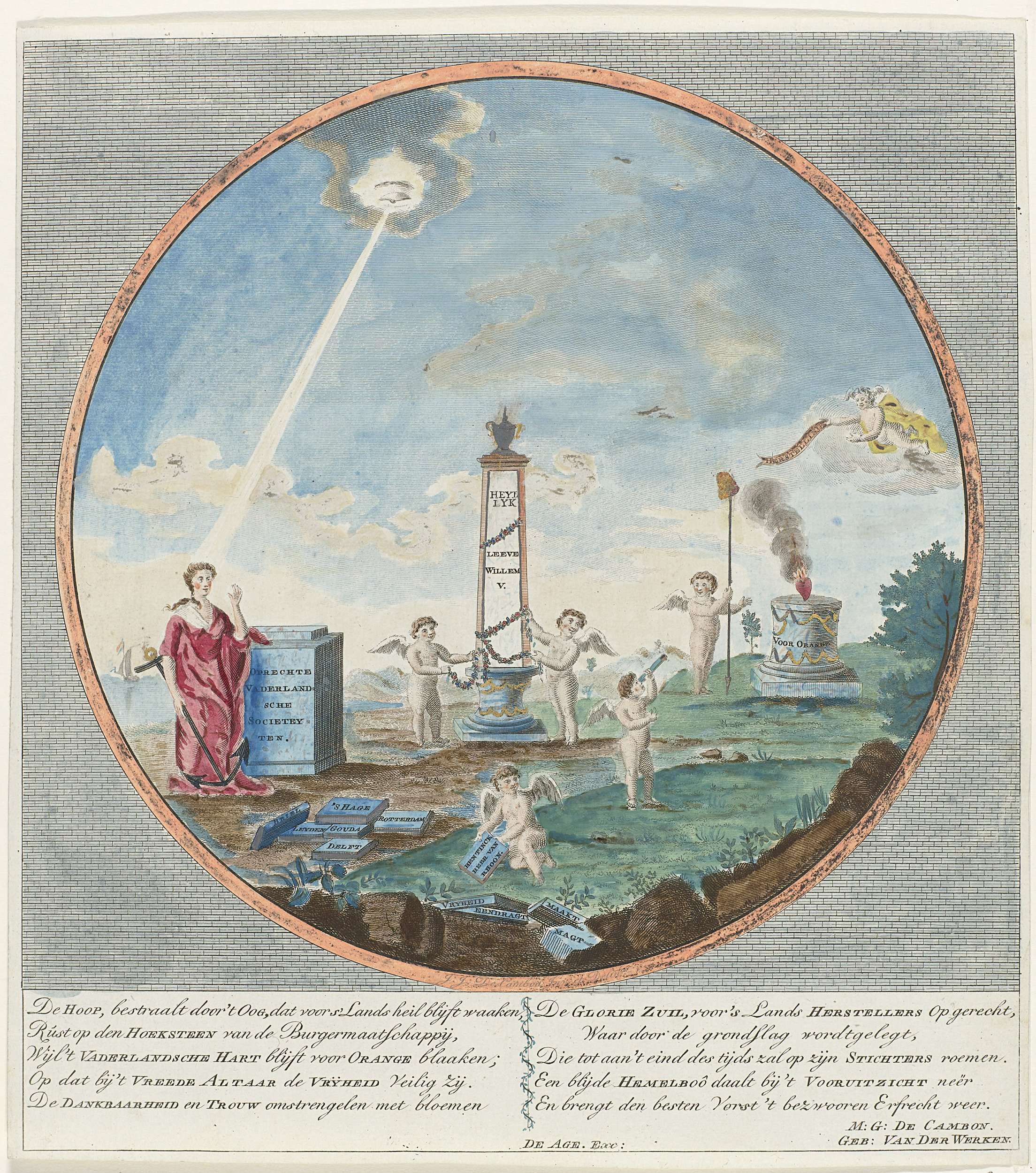 Allegorie op de oprichting van oranjegezinde Oprechte Vaderlandsche Sociëteiten in 1787. Ronde voorstelling met een tuin met de Hoop staande bij een altaar, verder putti bij een monument ter ere van prins Willem V en een altaar "Voor Oranje" waarop een brandend hart. De Hoop wordt beschenen vanuit de hemel door het Hemels Oog. Op ...