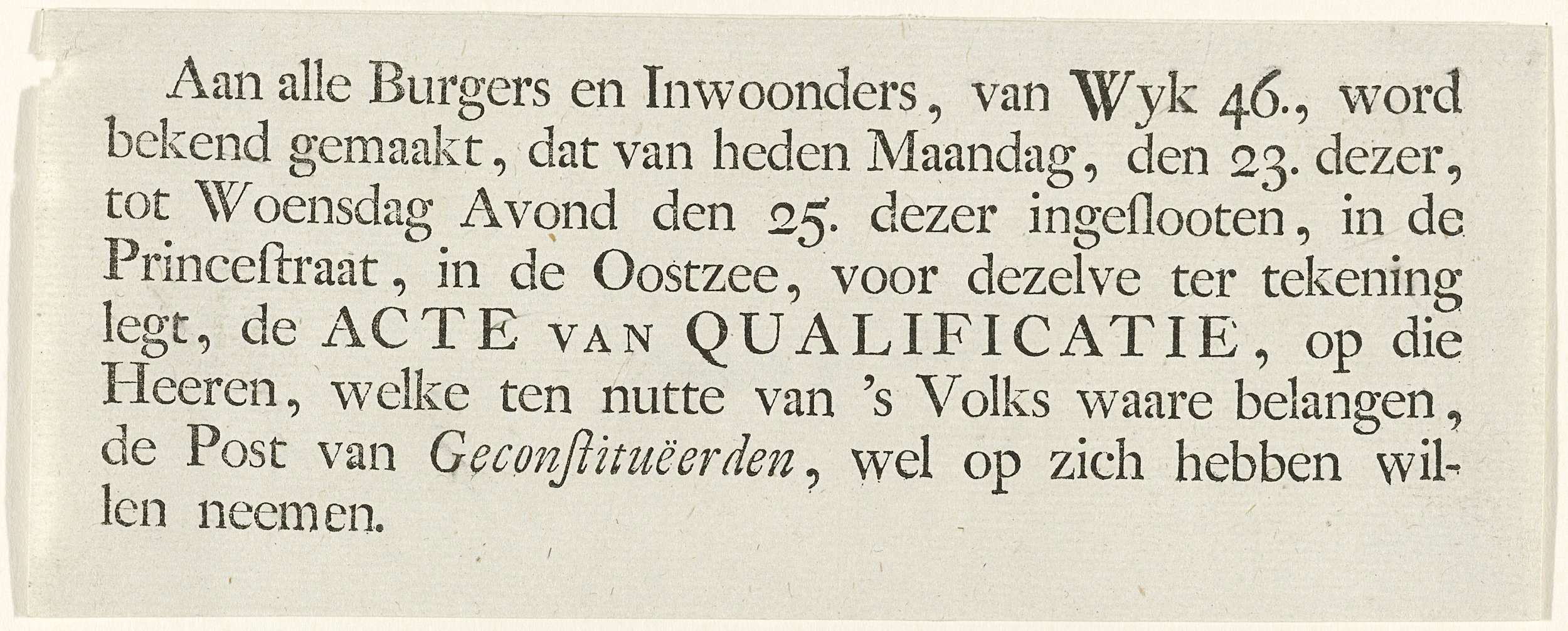 Strookje met de bekendmaking dat de Acte van Qualificatie van de personen die de post van Geconstitueerden op zich willen nemen, voor de bewoners van wijk 46 ter ondertekening klaarligt in de Princestraat, van 23-25 mei 1787.