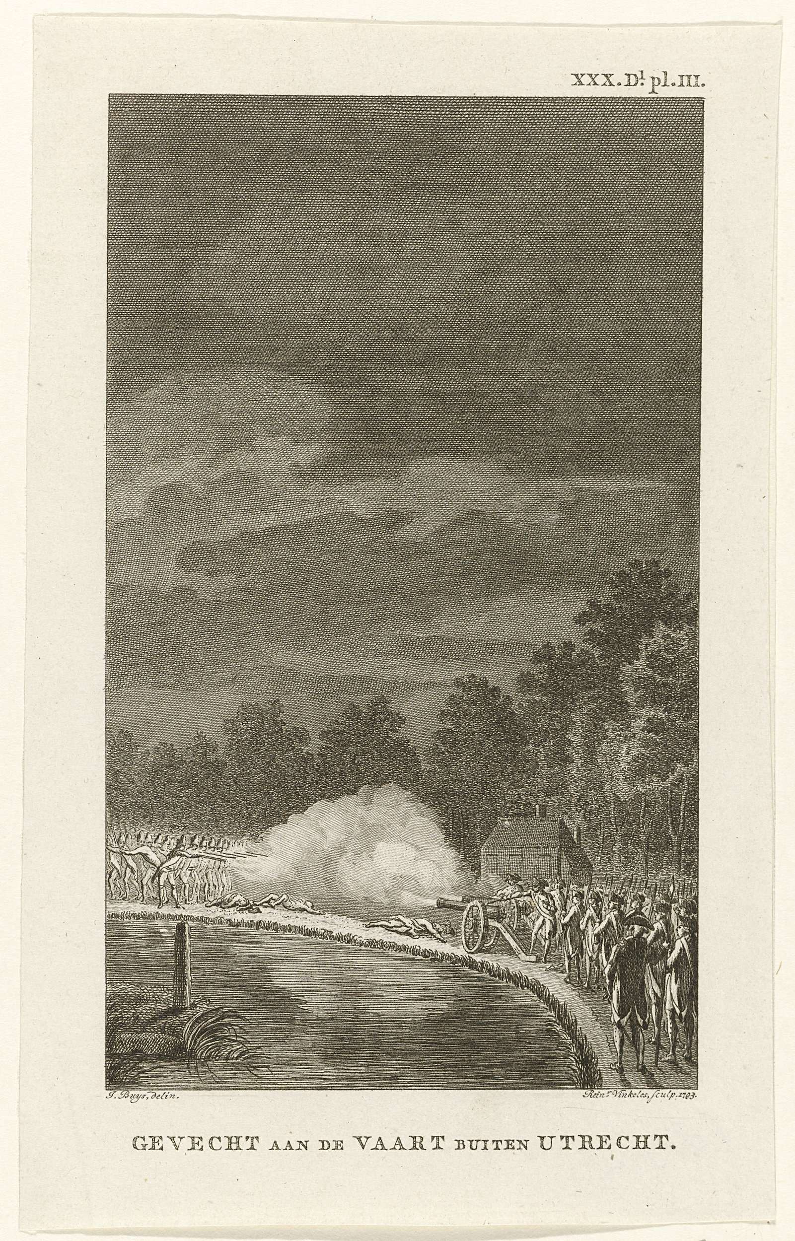 Vuurgevecht aan de vaart bij Vreeswijk buiten Utrecht tussen gewapende burgers van de Utrechtse schutterij en troepen van het regiment Van Efferen, in de avond van 9 mei 1787. Bovenaan gemerkt: XXX.Dl.pl.III.