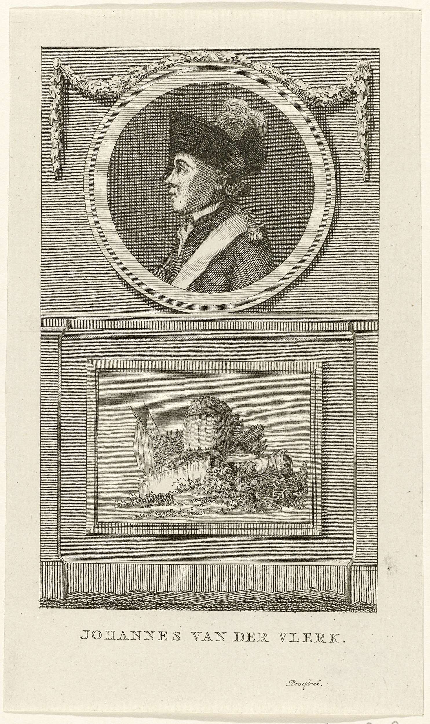 Blad met bovenaan een medaillon met het portret van kanonnier Johannes van der Vlerk, borstbeeld in profiel naar links, boven een trofee met kanon, kruitvat en vaandels. Hij sneuvelde in het gevecht bij Vreeswijk buiten Utrecht tussen gewapende burgers van de Utrechtse schutterij en troepen van het regiment Van Efferen op 9 mei 1787.
