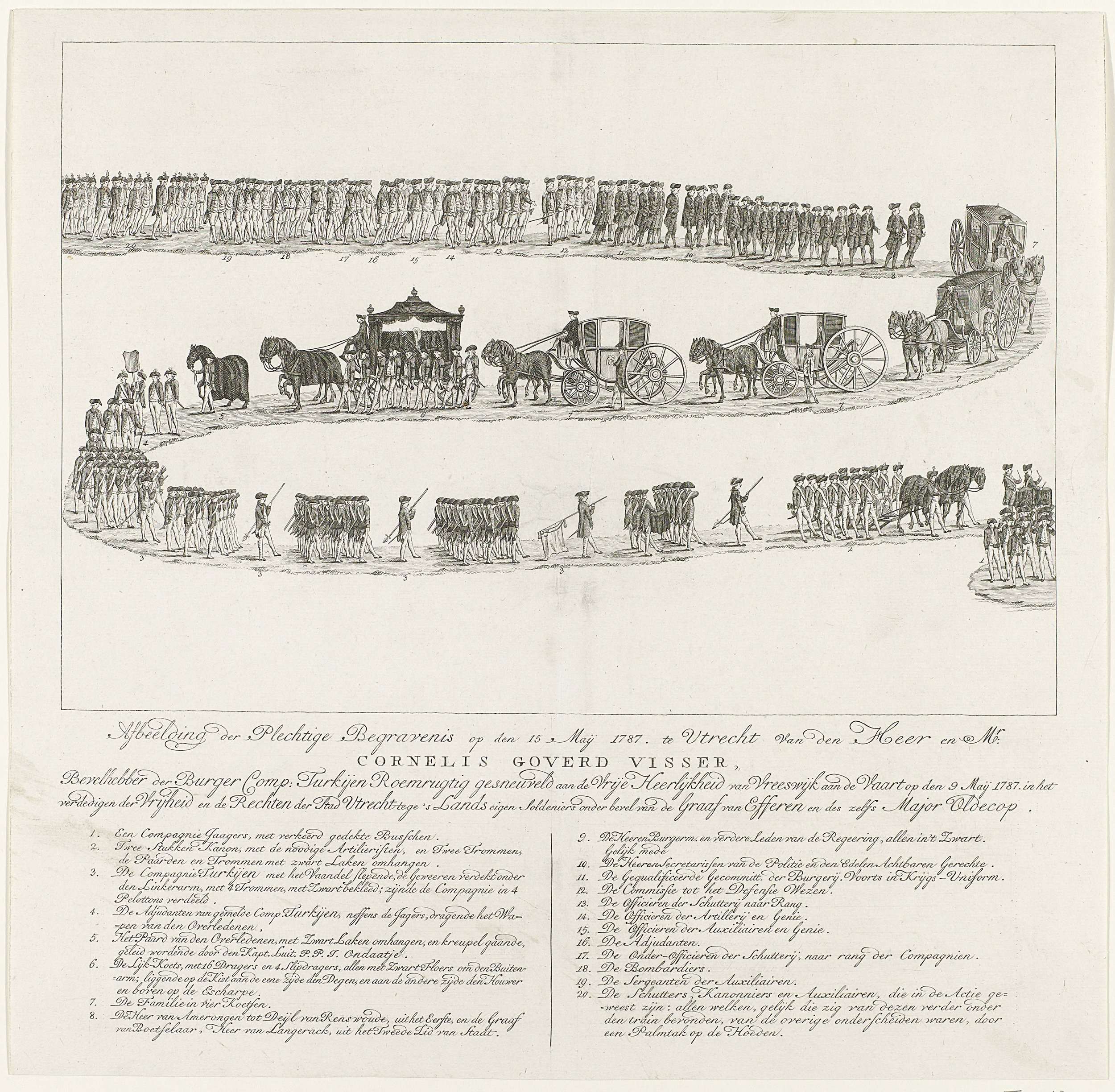 Begrafenis van Cornelis Govert Visscher, bevelhebber van de Utrechtse burgercompagnie Turkije, gesneuveld in het gevecht bij Vreeswijk op 9 mei, te Utrecht op 15 mei 1787. Begrafenisstoet in drie rijen. Op het blad onder de plaat de legenda 1-20 van de deelnemers in de stoet.