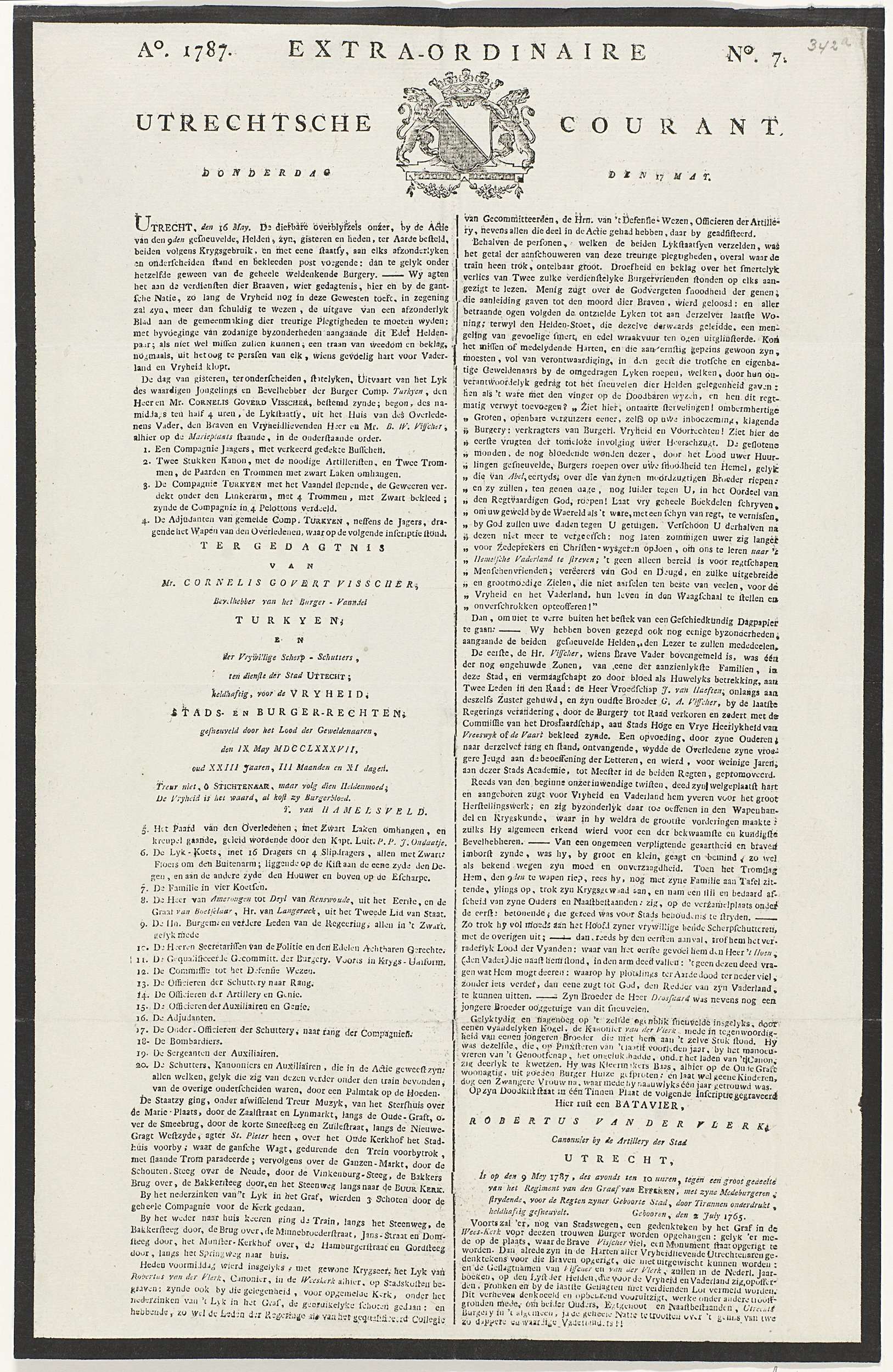 Aflevering nr. 7 van de Extra-Ordinaire Utrechtse Courant van 17 mei 1787 met een verslag van de begrafenis van Cornelis Govert Visscher (gesneuveld in het gevecht bij Vreeswijk op 9 mei) te Utrecht op 15 mei 1787. Blad gedrukt met zwarte rouwranden, tekst in twee kolommen, bovenaan een het stadswapen van Utrecht.
