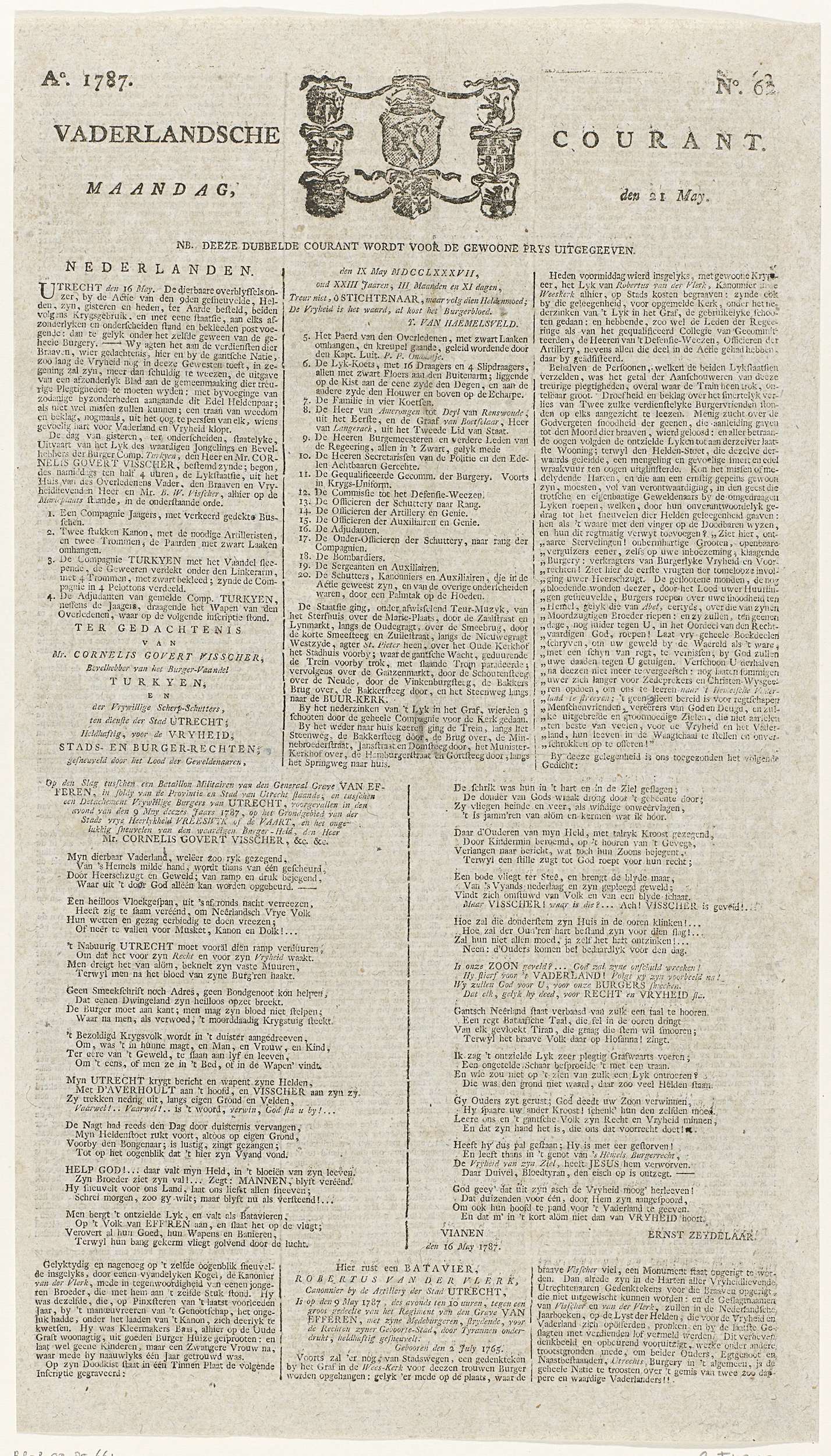 Aflevering nr. 62 van de Vaderlandsche Courant van 21 mei 1787 met een verslag van de begrafenis van Cornelis Govert Visscher (gesneuveld in het gevecht bij Vreeswijk op 9 mei) te Utrecht op 15 mei 1787. Blad met tekst in drie en twee kolommen, bovenaan de wapens van de Republiek. Blad bedrukt op beide zijden.