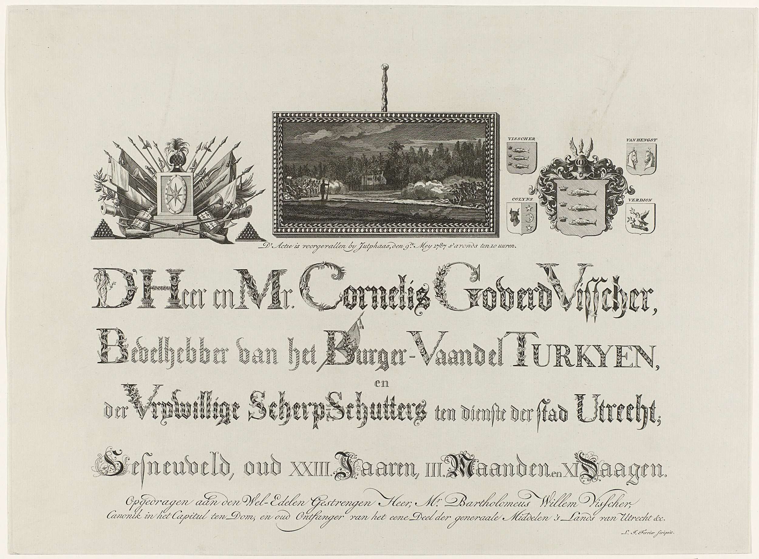 Blad met opschrift in kalligrafie ter nagedachtenis van Cornelis Govert Visscher, bevelhebber van de Utrechtse burgercompagnie Turkije, gesneuveld in het gevecht bij Vreeswijk op 9 mei 1787. Op het blad verder een voorstelling van het vuurgevecht, een wapentrofee en het familiewapen Visscher omgeven door vier andere wapens.