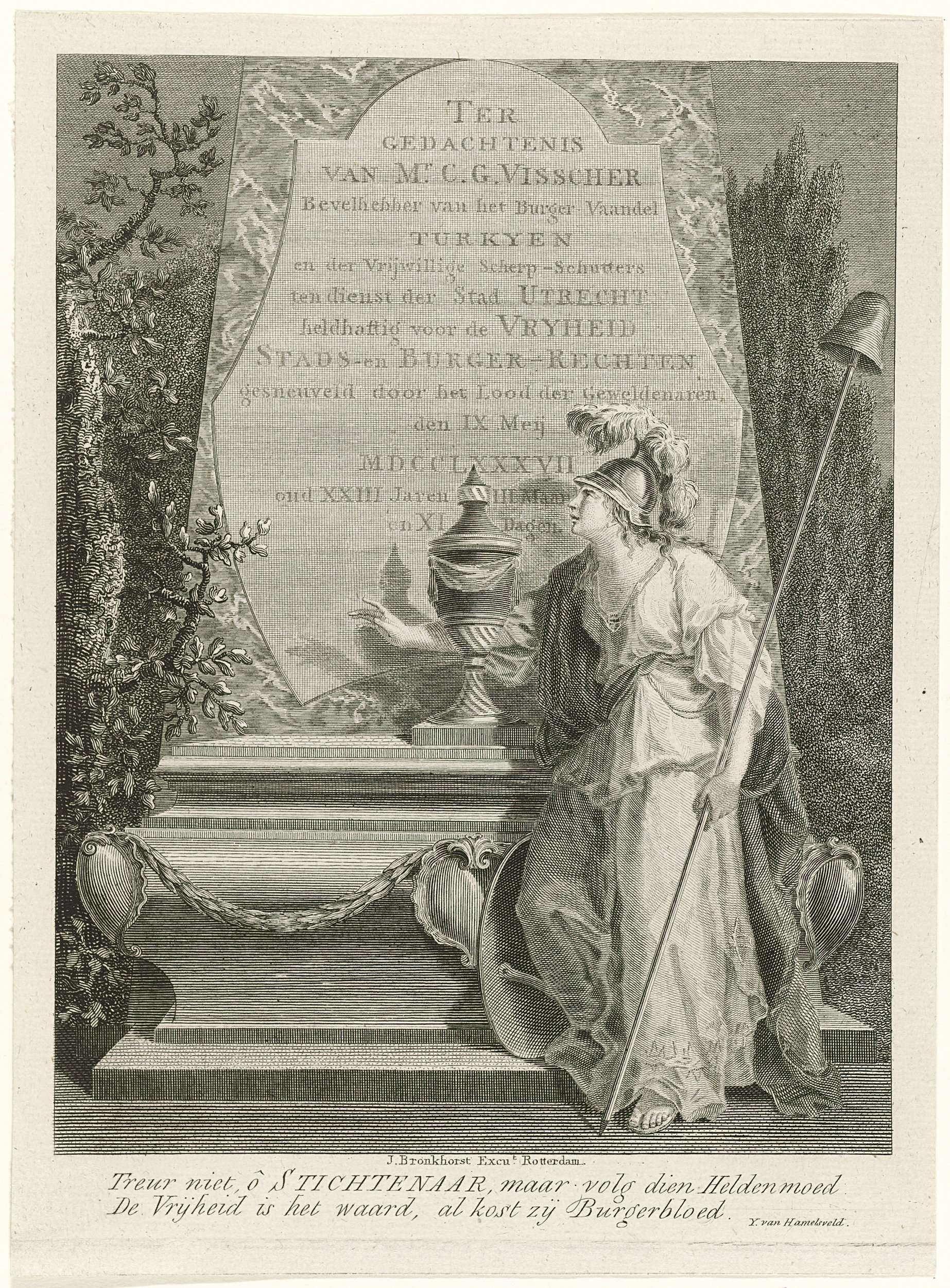 Allegorisch grafmonument ter nagedachtenis van Cornelis Govert Visscher, bevelhebber van de Utrechtse burgercompagnie Turkije, gesneuveld in het gevecht bij Vreeswijk op 9 mei 1787. De Nederlandse Vrijheid treurend bij het graf. Met tweeregelig vers in onderschrift.