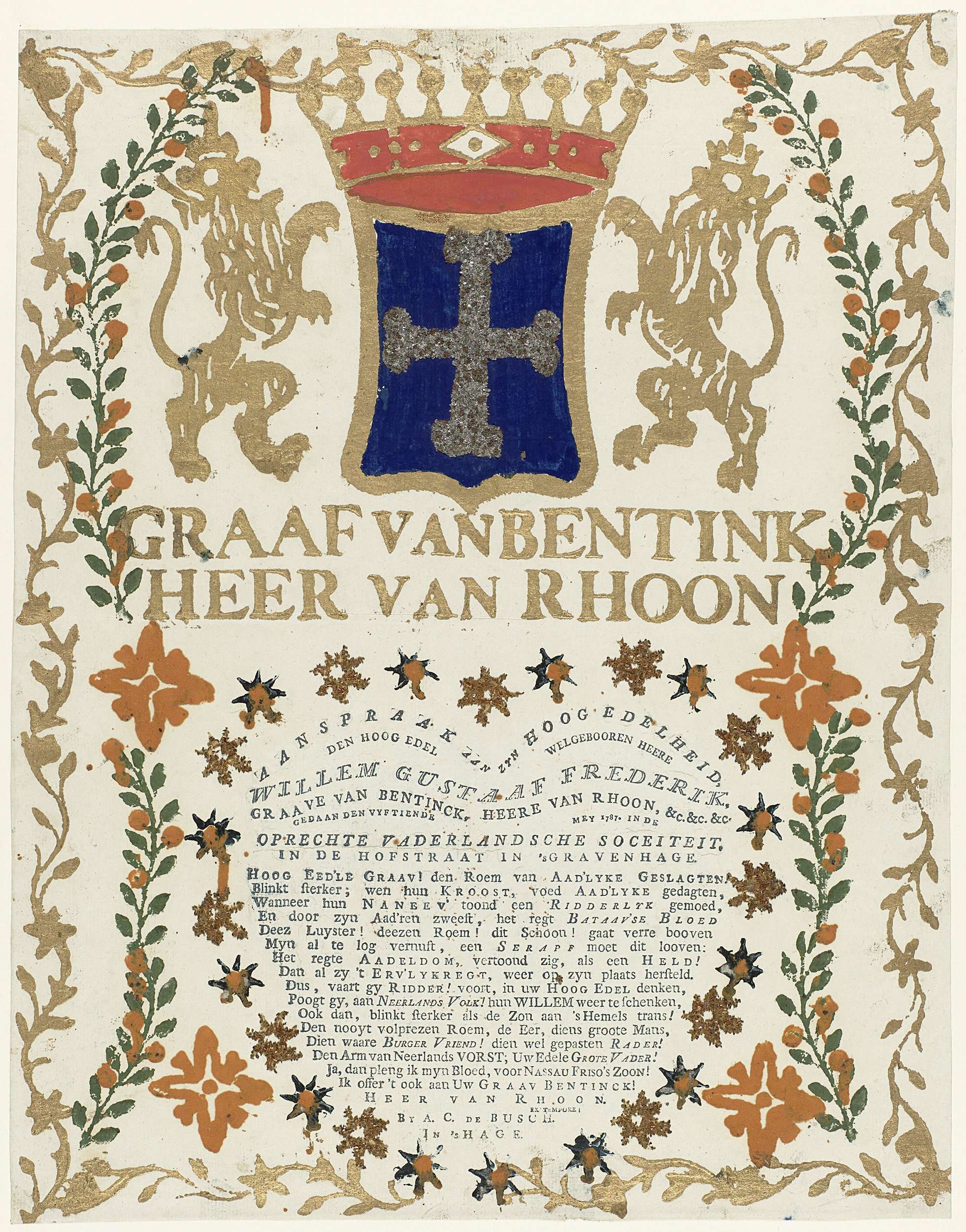 Decoratief blad met een aanspraak aan Willem Gustaaf Bentinck, in de vorm van een vers van zestien regels, ex tempore gedaan op 15 mei 1787 in de Oprechte Vaderlandsche Sociëteit te Den Haag. Het blad versierd met in kleuren en goud gedrukte en geschilderde bloemranken, oranjetakken, sterren en het wapen van de graaf van Bentinck.