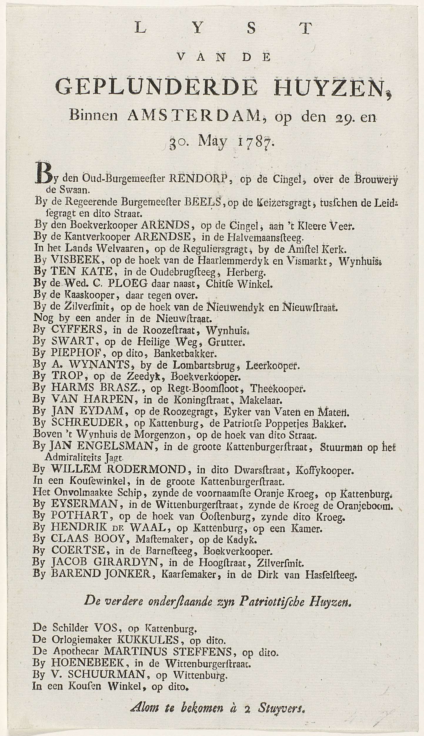 Gedrukte lijst van de huizen van Orangisten, en enkele Patriotten, in Amsterdam geplunderd op 29 en 30 mei 1787.