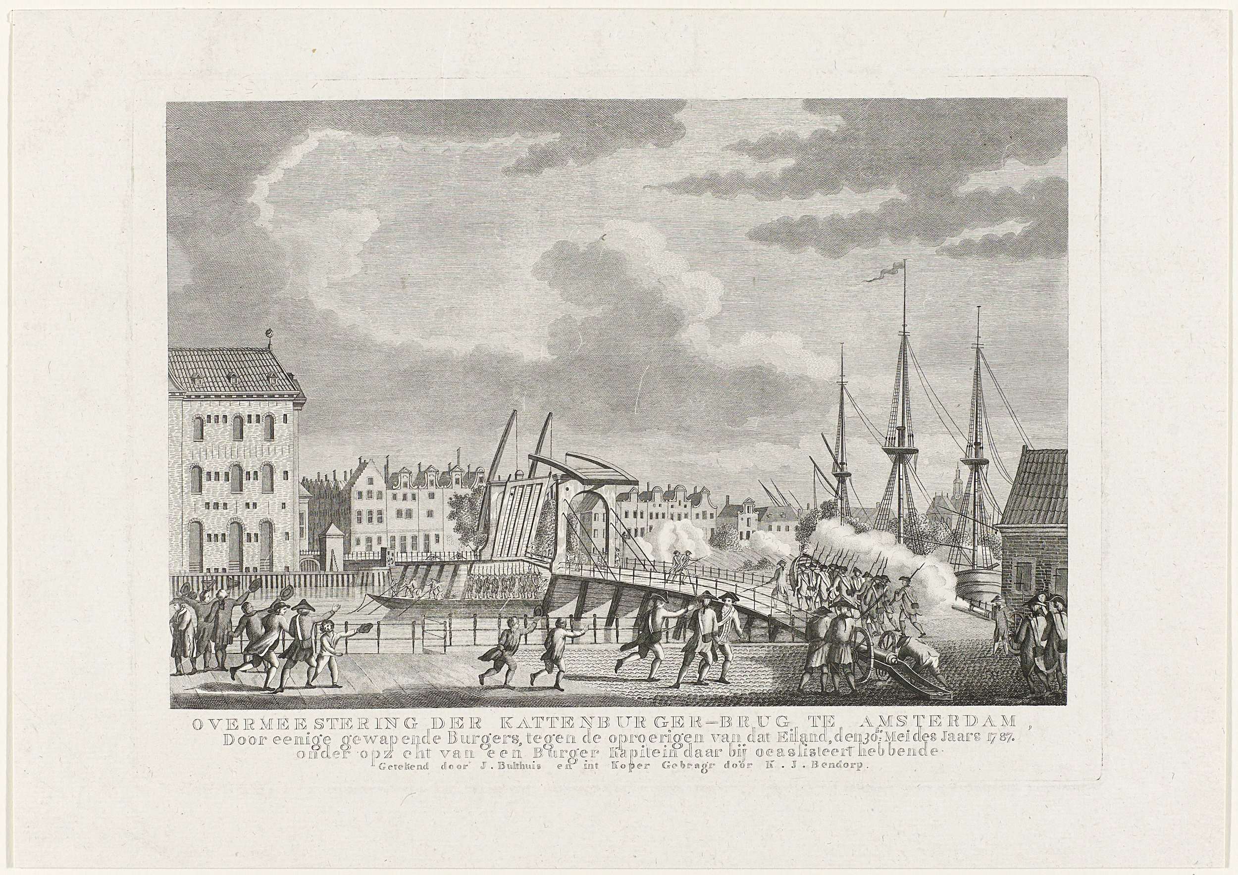 De verovering van de Kattenburgerbrug naar het eiland Kattenburg op de opstandige Oranjegezinden door de gewapende Amsterdamse burgers, 30 mei 1787. Links een deel van 's Lands Zeemagazijn.