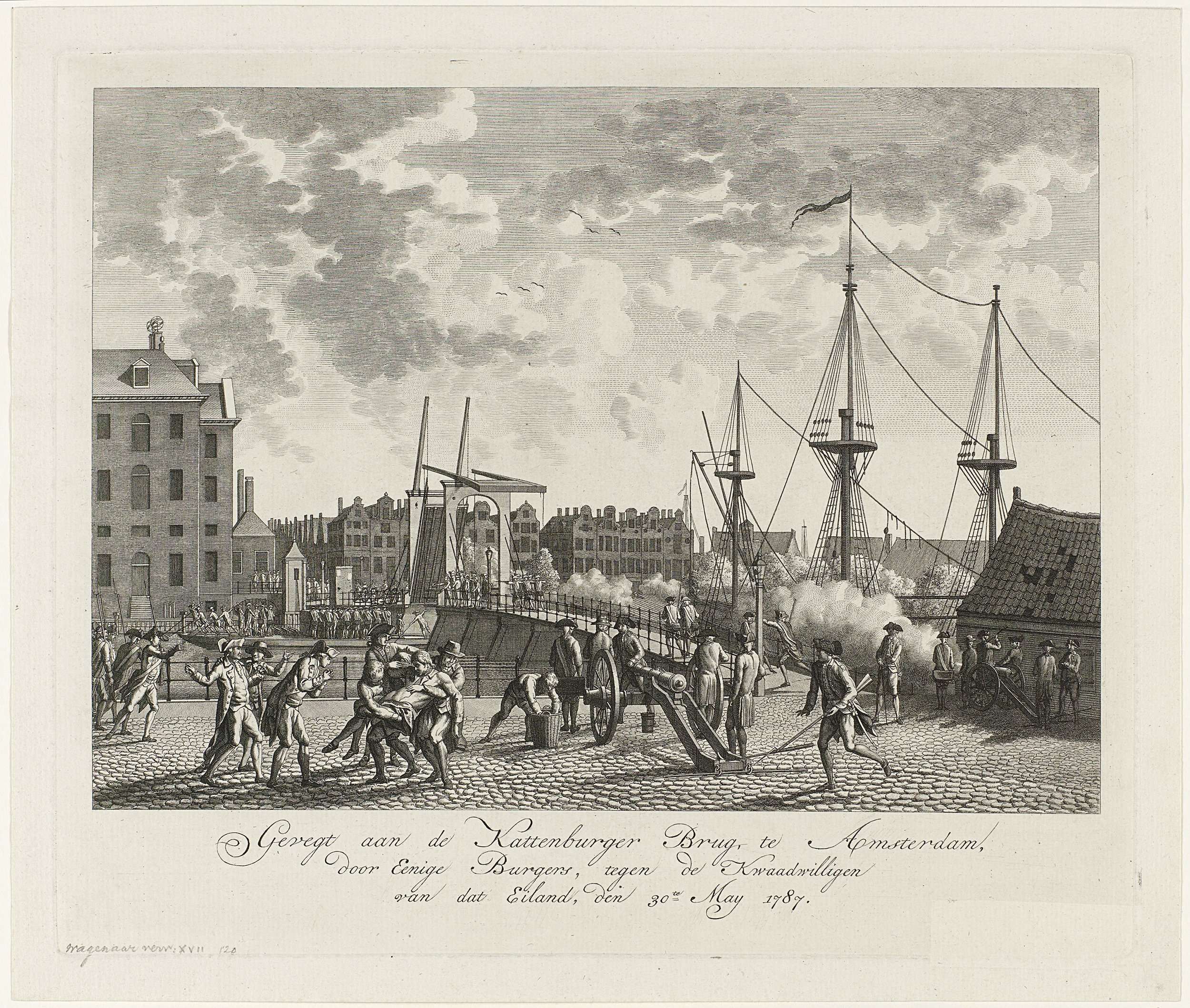 De verovering van de Kattenburgerbrug naar het eiland Kattenburg op de opstandige Oranjegezinden door de gewapende Amsterdamse burgers, 30 mei 1787. Links een deel van 's Lands Zeemagazijn. Rechtsonder is een opschrift door een cache afgedekt.