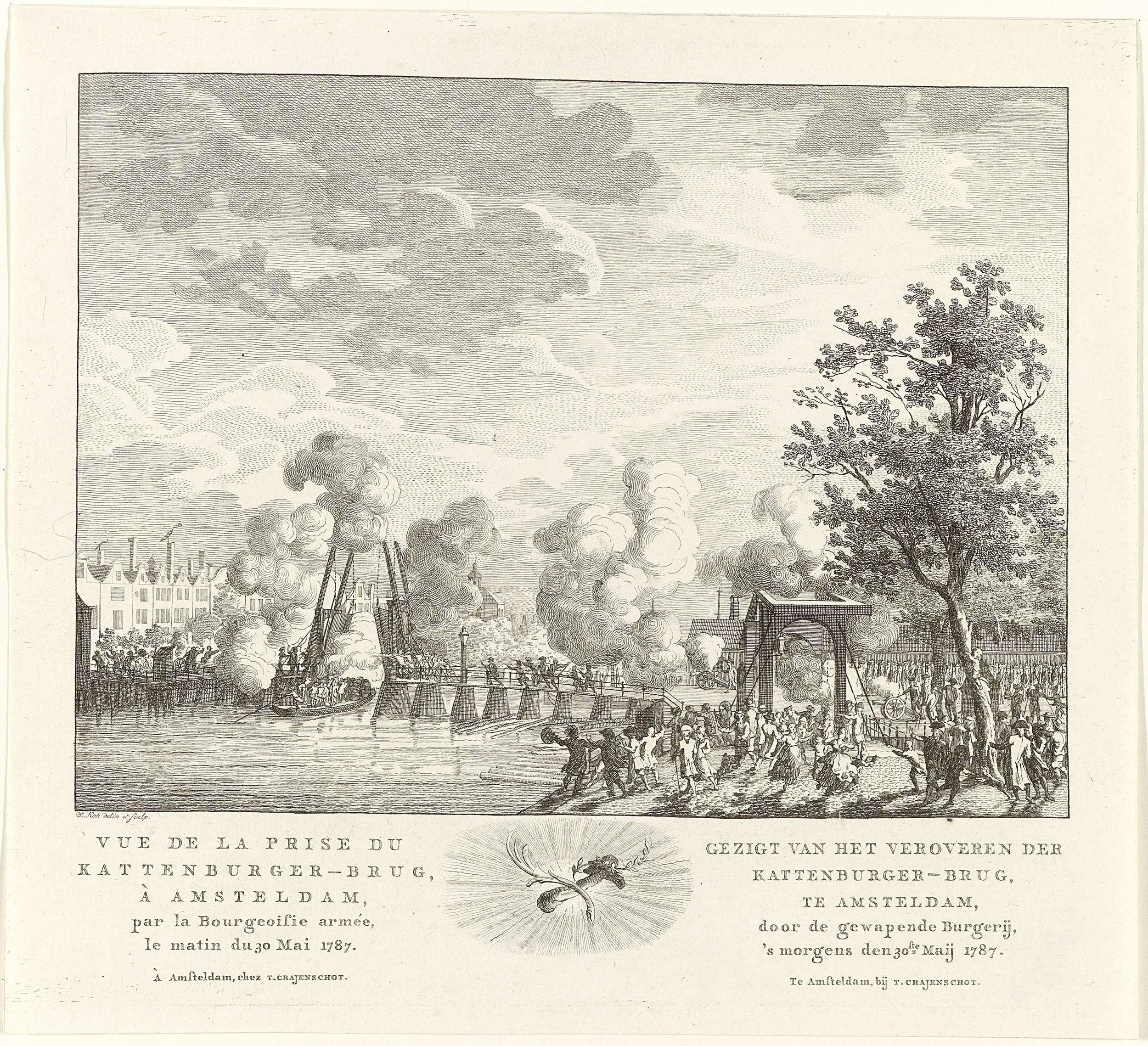 De verovering van de Kattenburgerbrug naar het eiland Kattenburg op de opstandige Oranjegezinden door de gewapende Amsterdamse burgers, 30 mei 1787.