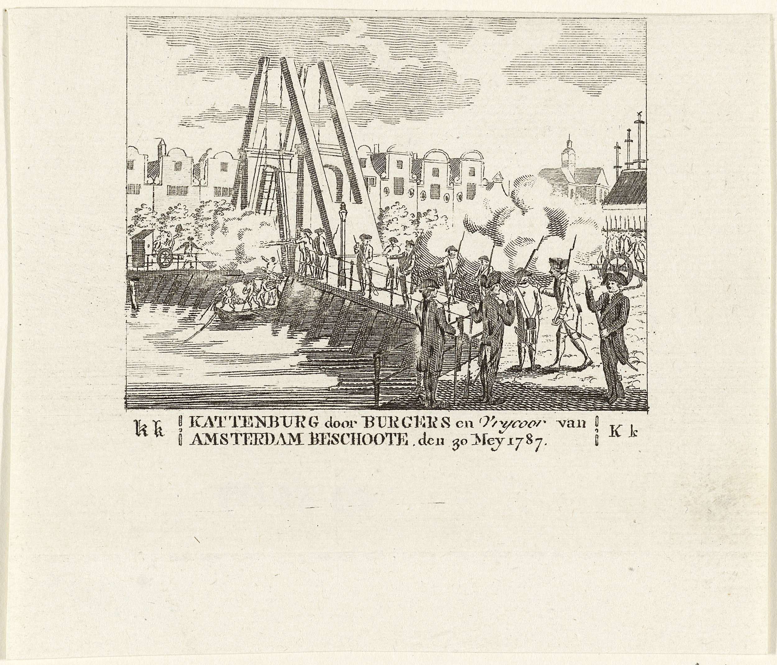 De verovering van de Kattenburgerbrug naar het eiland Kattenburg op de opstandige Oranjegezinden door de gewapende Amsterdamse burgers, 30 mei 1787. Plaatje behorend bij de letter K uit een ABC boek.