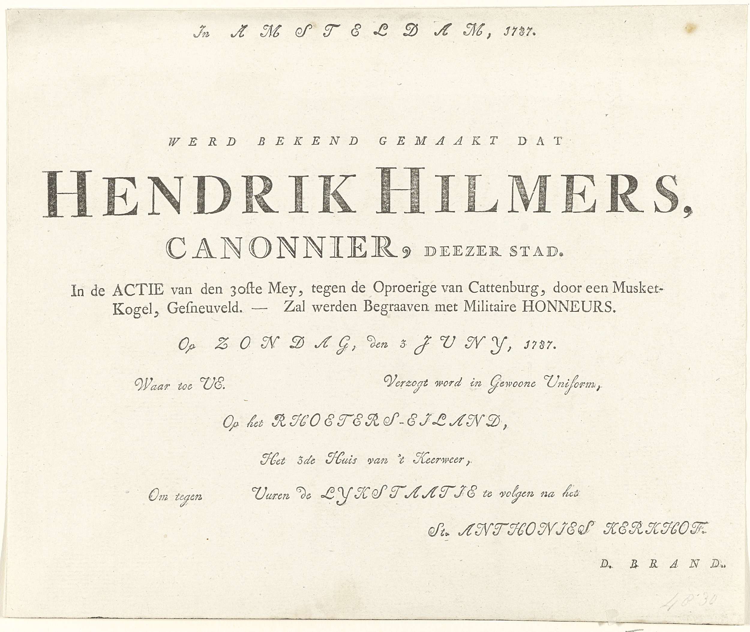 Begrafenisbriefje. Bekendmaking en uitnodiging voor het bijwonen van de begrafenis op 3 juni van Hendrik Hilmers, kanonnier gesneuveld tijdens het oproer op Kattenburg in Amsterdam op 30 mei 1787.